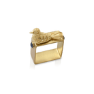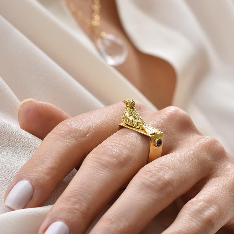 Bird ring on square base in 18k gold and sapphires accents inspired by the Helenistic Art.