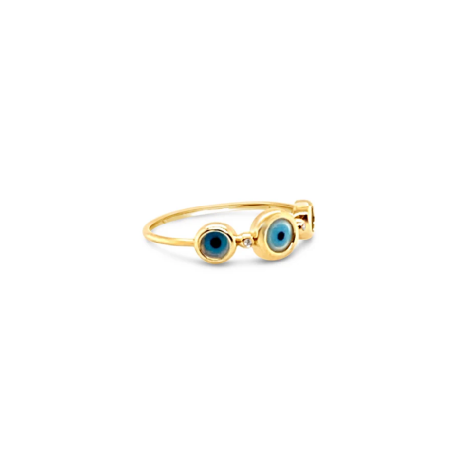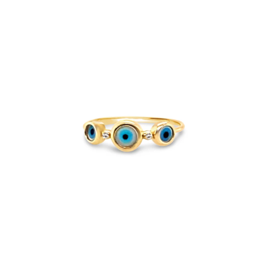This delicate ring 14k gold ring features three mother of pearl eyes separated by diamonds. Wear on its own or stack with others from our Evil Eye collection.