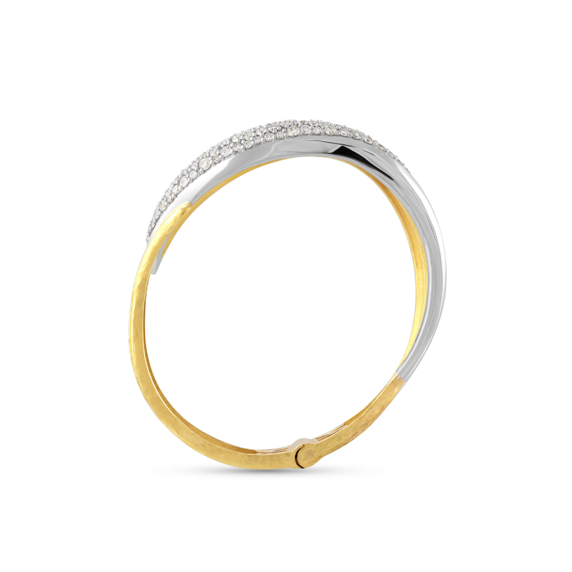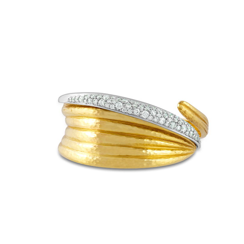 A limited edition 70th Anniversary bracelet handmade by Vendorafa, the Foglie70 cuff bracelet has a wide band of hammered 18K yellow and white gold with 2.0ctw inlaid round brilliant diamonds. Handcrafted in Italy.