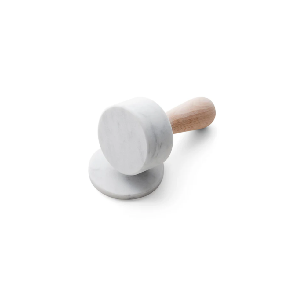 The white polished Carrara marble tenderizer has been designed to be elegant and functional. The wood was carefully chosen as a material for the handle, to adhere perfectly to the hand and not slip.