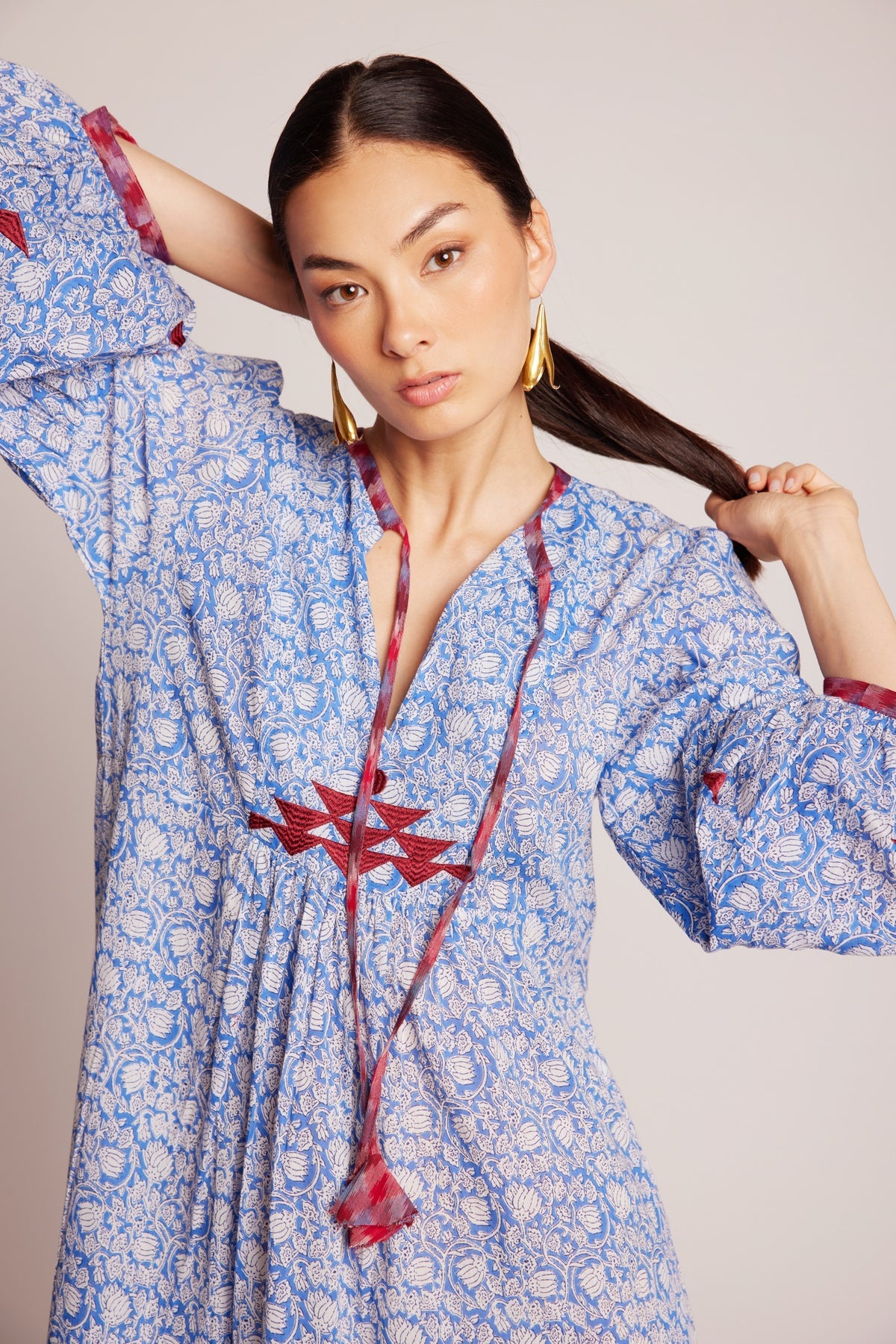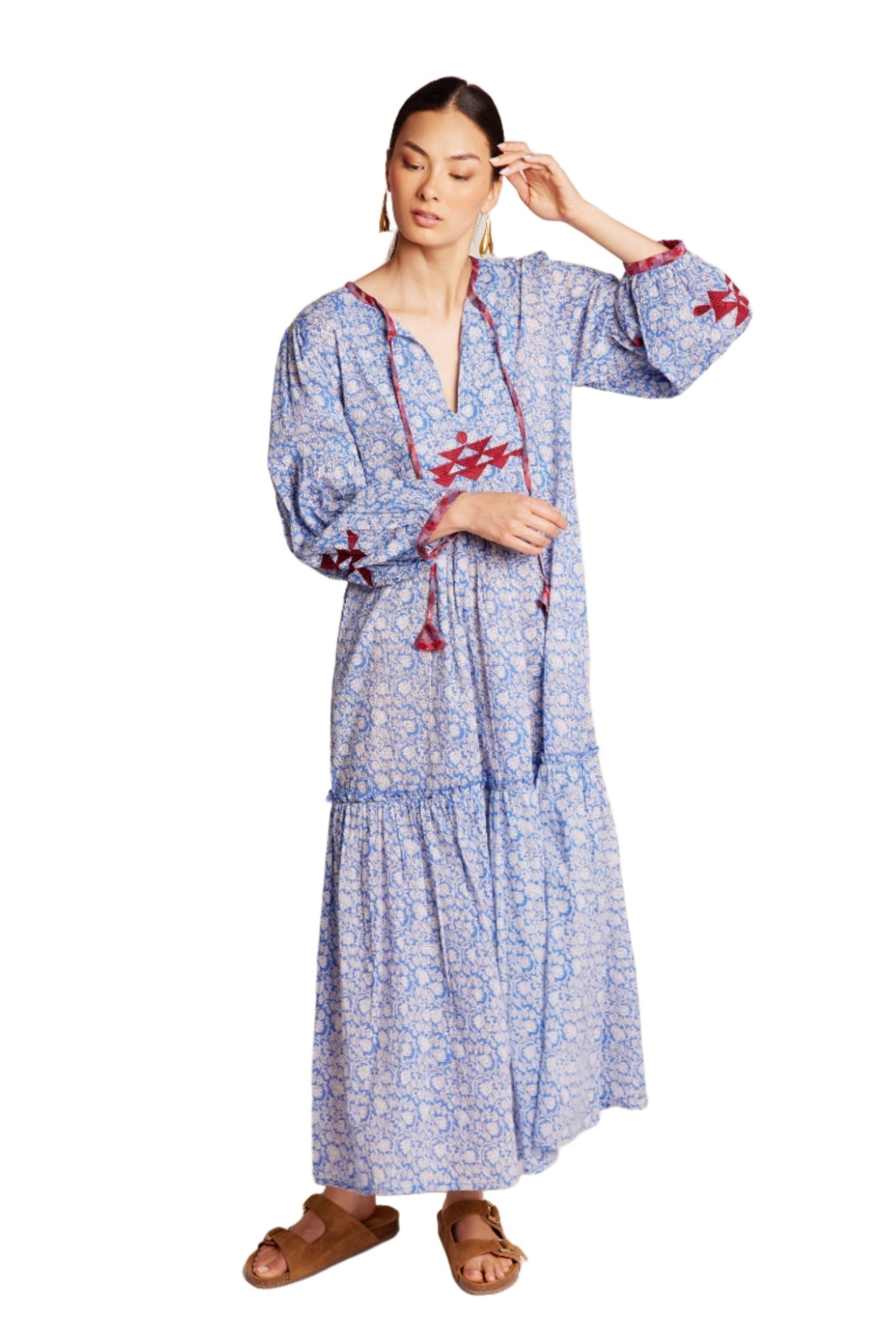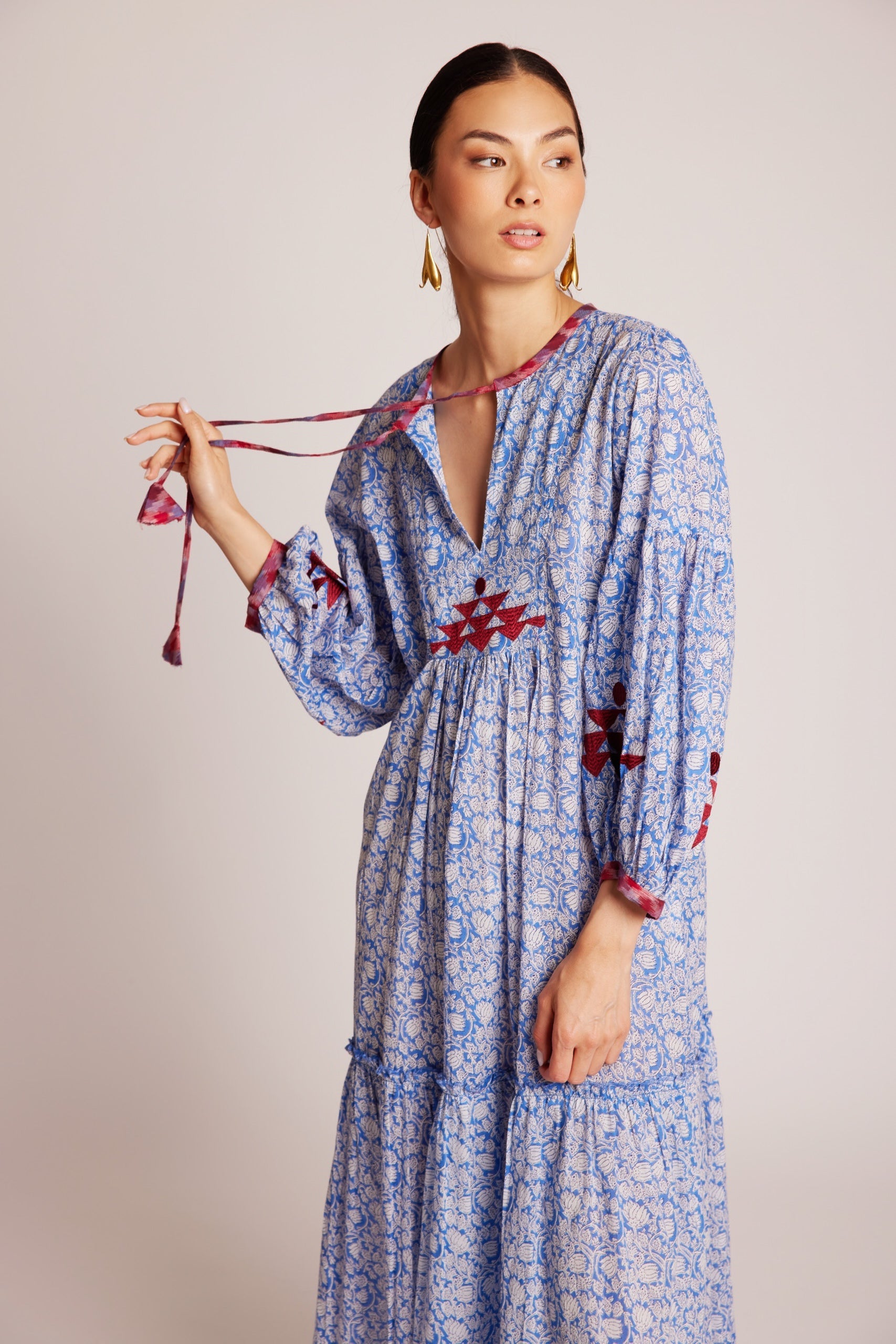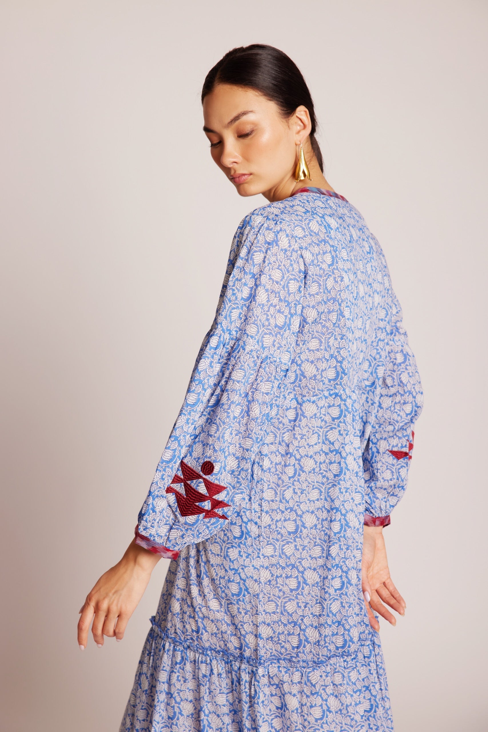 Endless summer skies. Our Bengal Blue Maxi Dress is a delight – in a pale blue and white floral hand blockprinted fabric, adorned with raspberry red and blue Ikat details on the chest, the tassels and cuffs. Crafted from the lightest 100% cotton voile, it is embellished with ruby red, pure silk embroidery on the front and along the gathered, ¾ length sleeves. A full length dress that embodies comfort and style – with a kick and a flounce, for those sun-drenched, lazy afternoons, impromptu outings, or laid-back dinners with friends.
