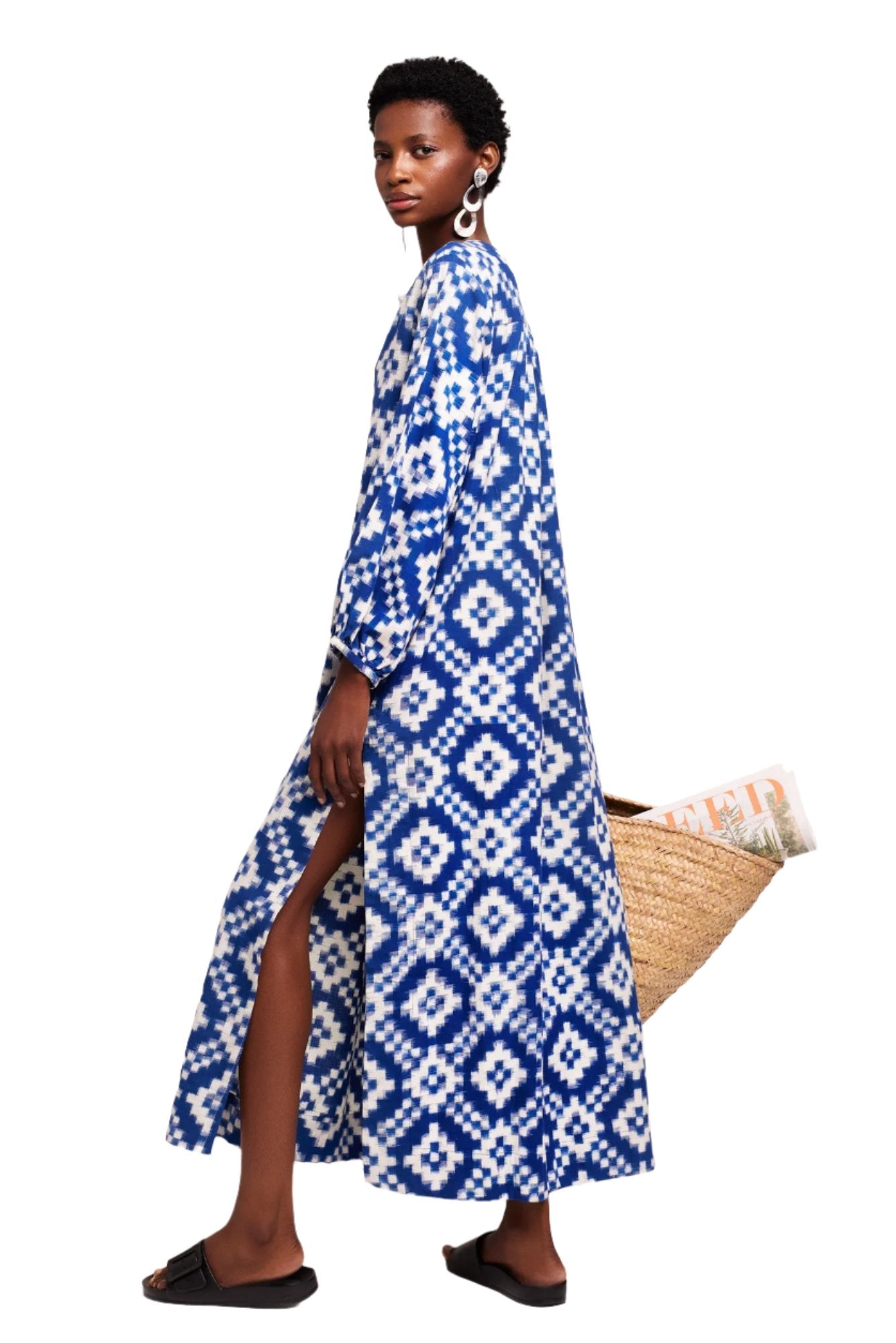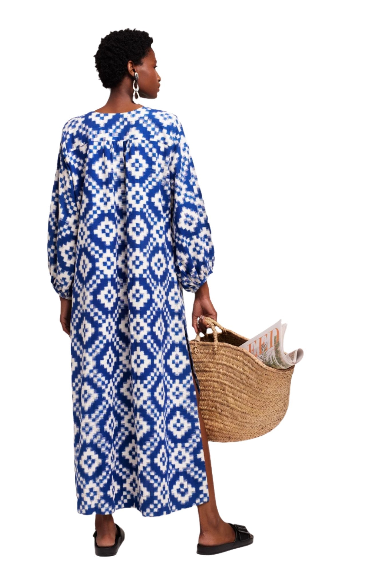 We’re thrilled with our DORCAS BLUE Kaftan, in stunning geometric bright blue and white. A statement piece if there ever was one - and its striking colour combination will really take you from day to nightwear