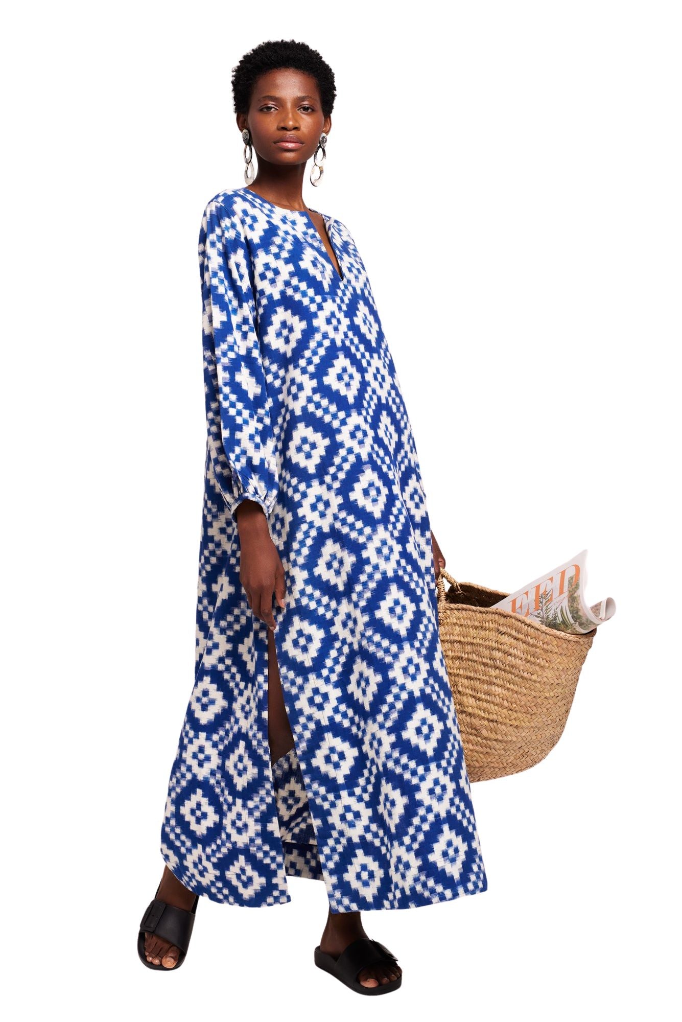 Handcrafted using age-old techniques, our double IKAT Kaftans’ 100% cotton yarns are resist-dyed, twirled and skillfully hand-loomed to create a shaded-pattern effect.