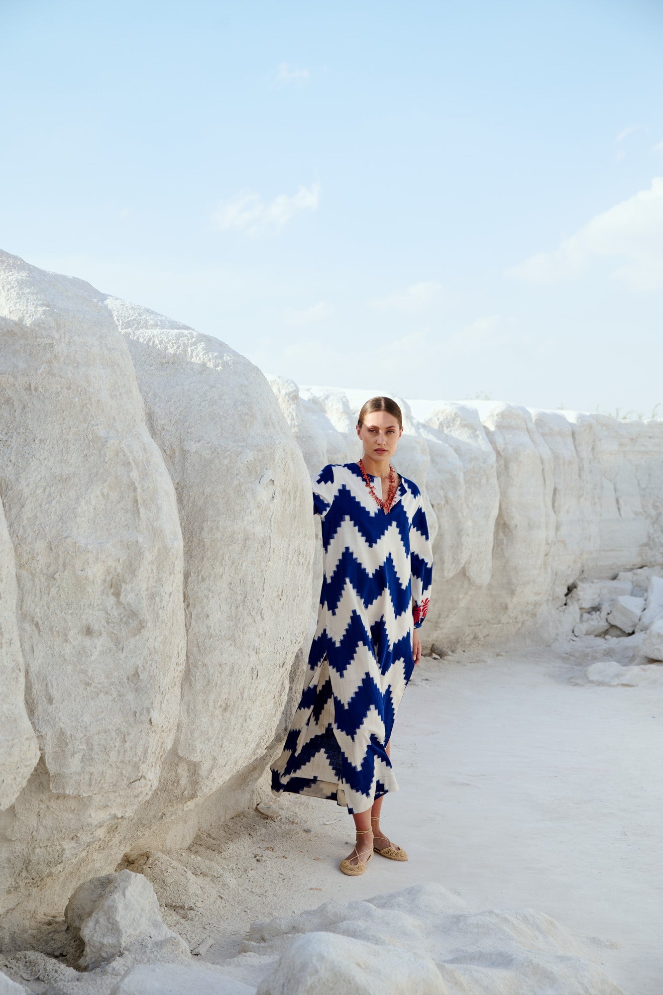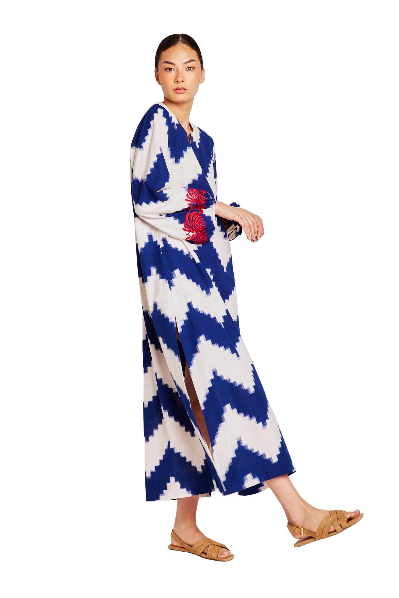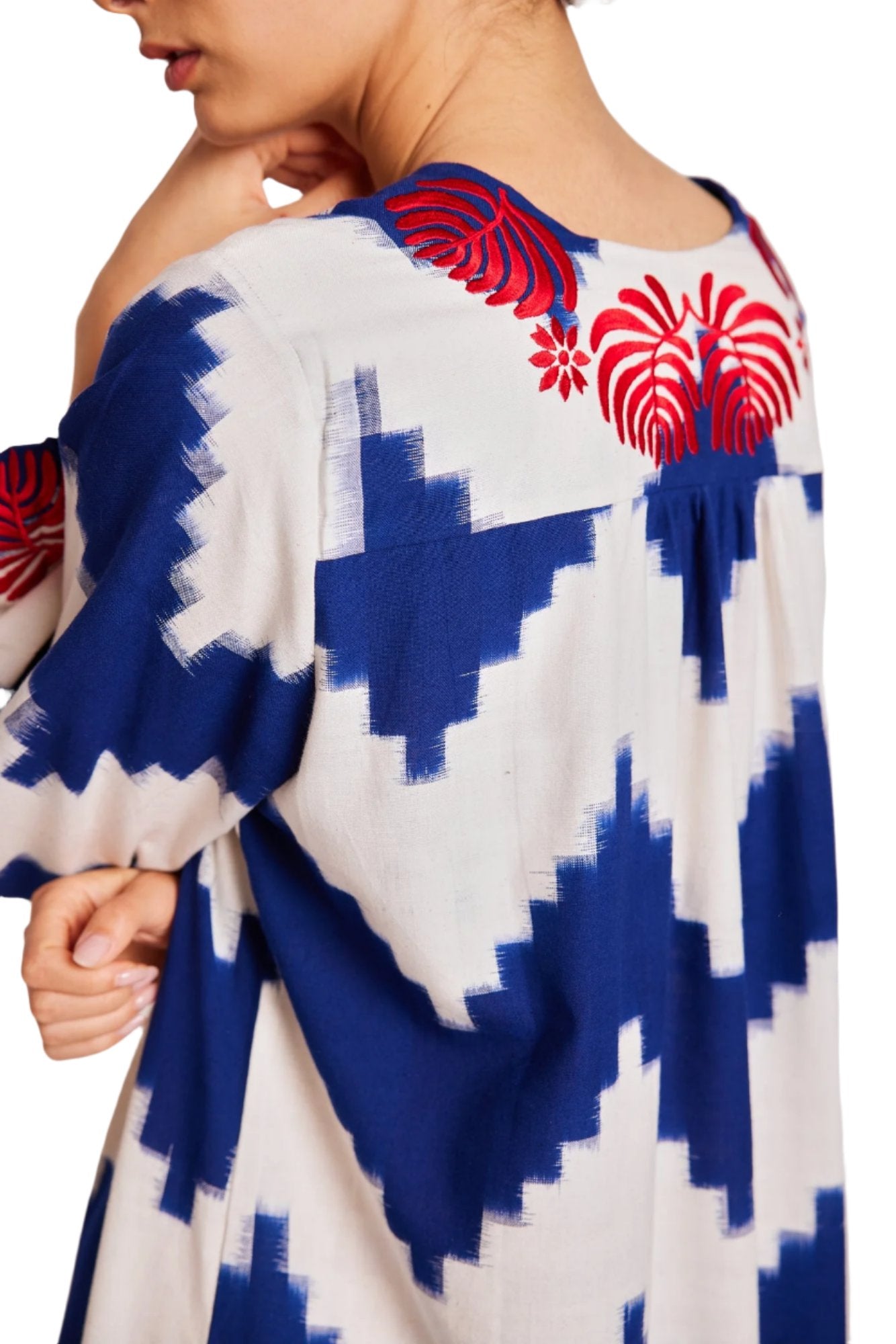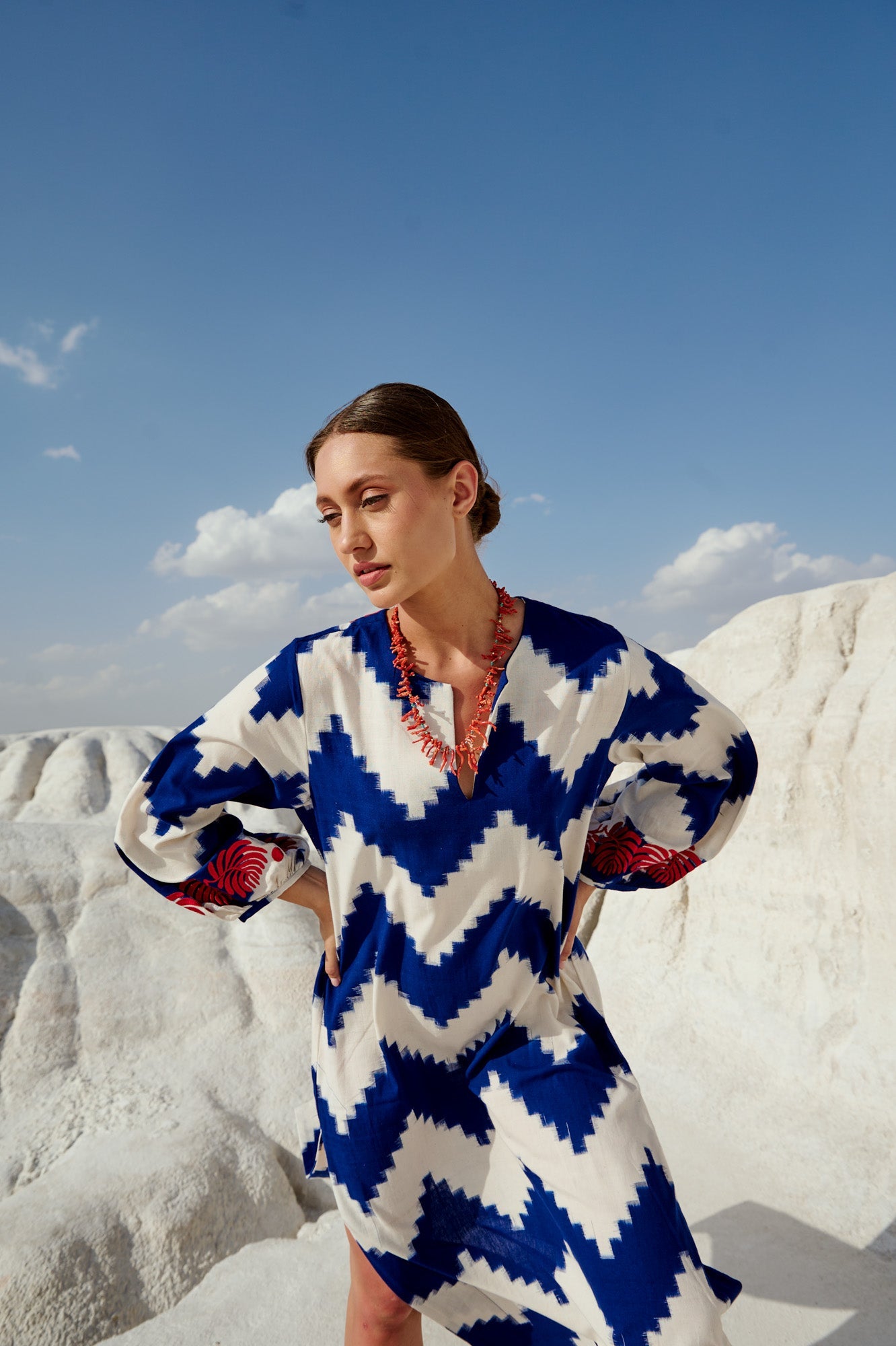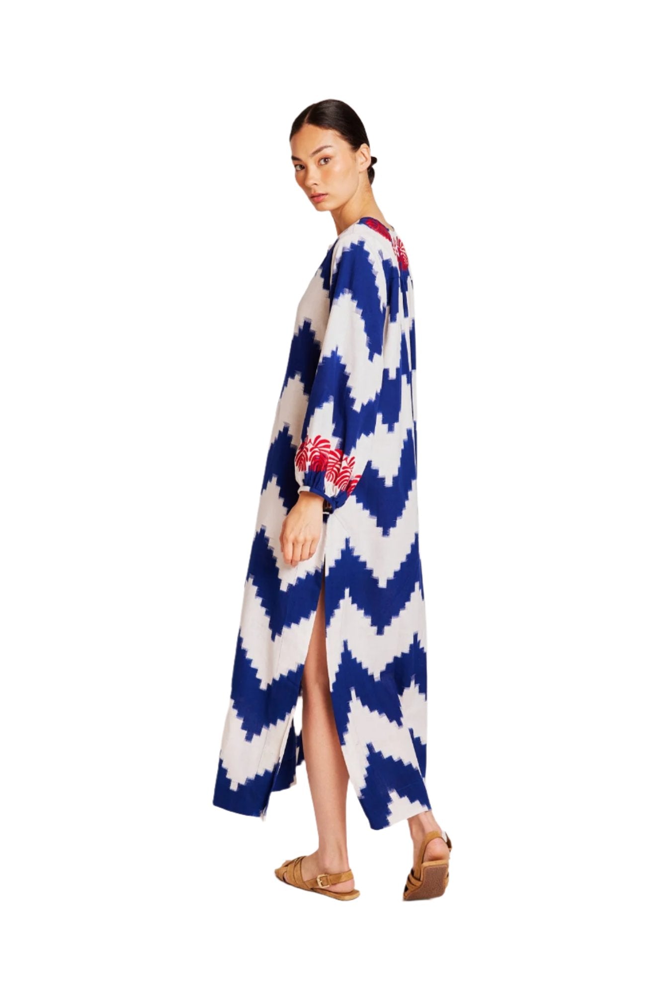 The irresistible outsize zigzag blue pattern is complemented by unabashedly electric red, embroidered flower bursts in pure silk, around the neck, bodice, and sleeves.