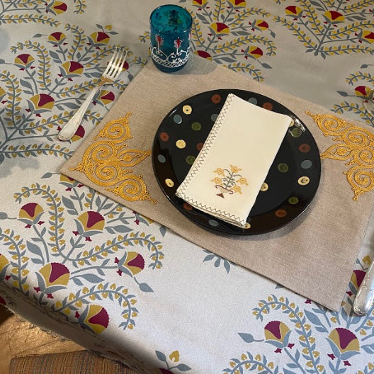 Each placemat is skilfully hand embroidered by the brilliant women at the Malaika Embroidery Training Centre (TOH) in Cairo.