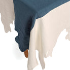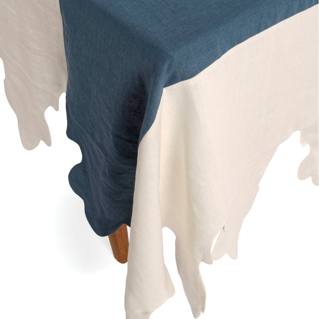 Playing on recognizable features of architecture found in Historic Cairo, our Sultana Tablecloth is a modern take on traditional design. Featuring a repeated cut-out border design and bold patchwork stripes in blue and ecru linen, it is a showstopper.