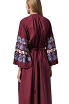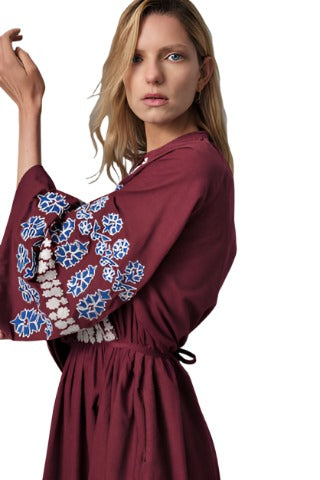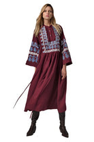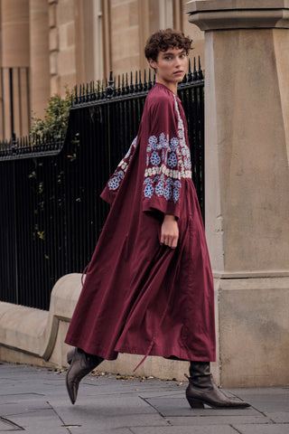Celebrating the craft of embroidery that is true to the heritage of MEGAN PARK, the Willow Embroidered Dress is an artisanal beauty. Crafted from a soft claret cotton pinwale corduroy, the folkloric chainstitch embroidery decorating the sleeves and bib create a dress that you will wear and treasure for years to come. The oversized smock style silhouette can be shaped back to the waist if less volume is preferred when tying the small ties into a bow at the back. Embody the cool bohemian which is imbued in this style.