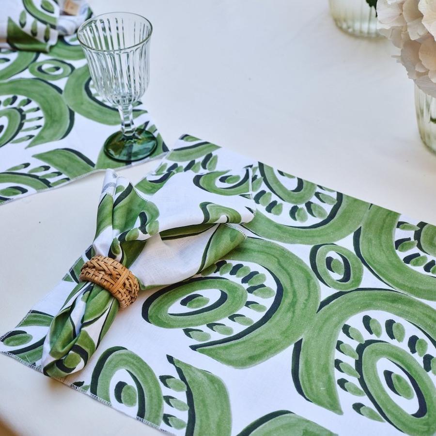 Hand-stitched linen napkins adorned with the mosaic pattern in blue, green or beige. (Set of 2)