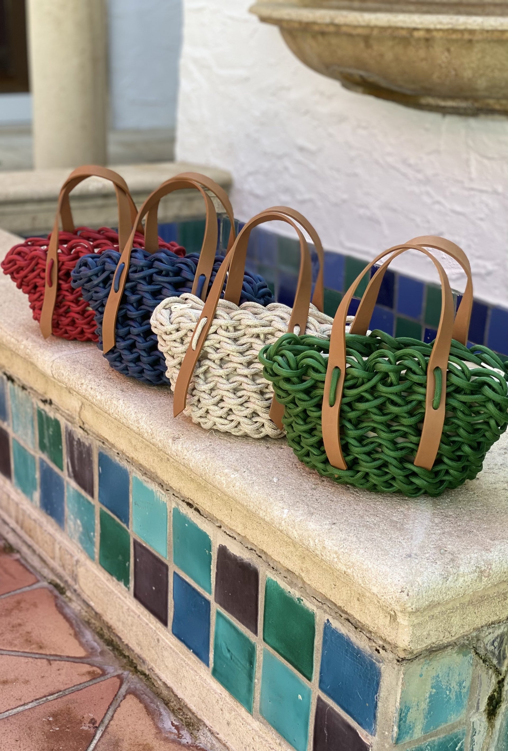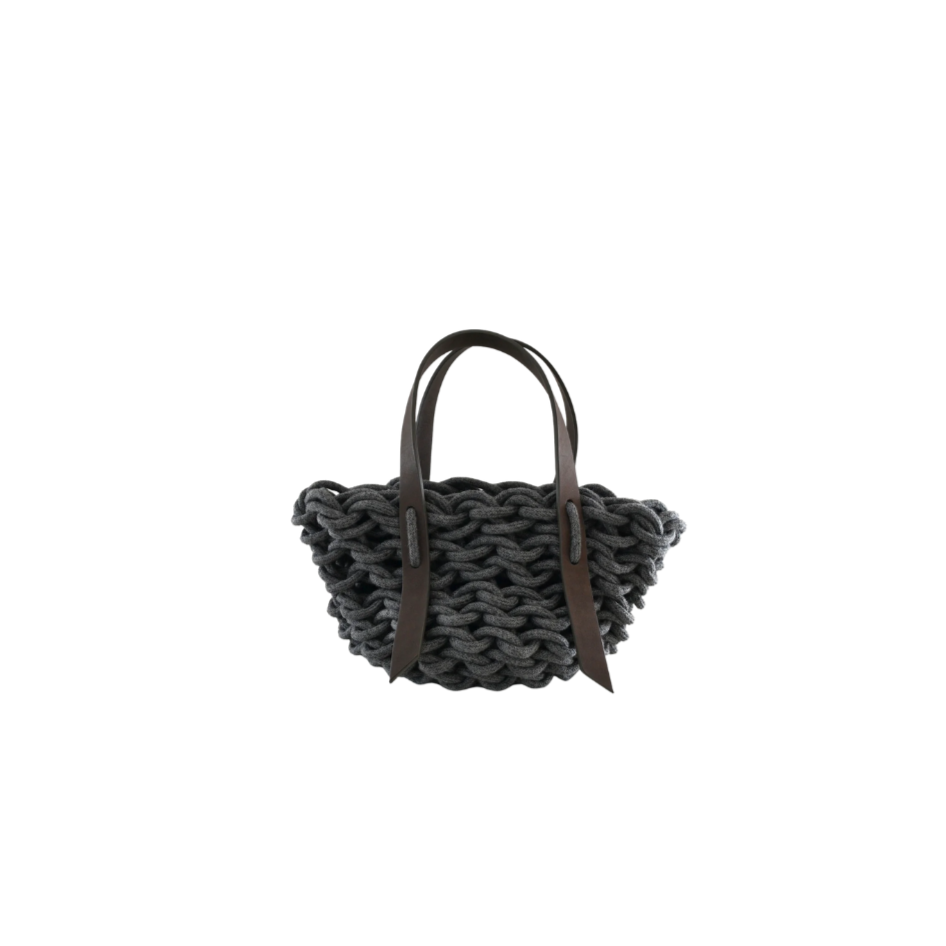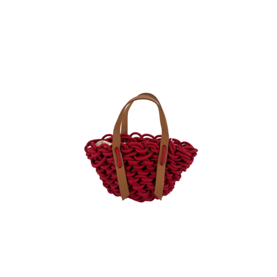 hand made woven bag realized with natural waxed cotton rope and biodegradable leather.