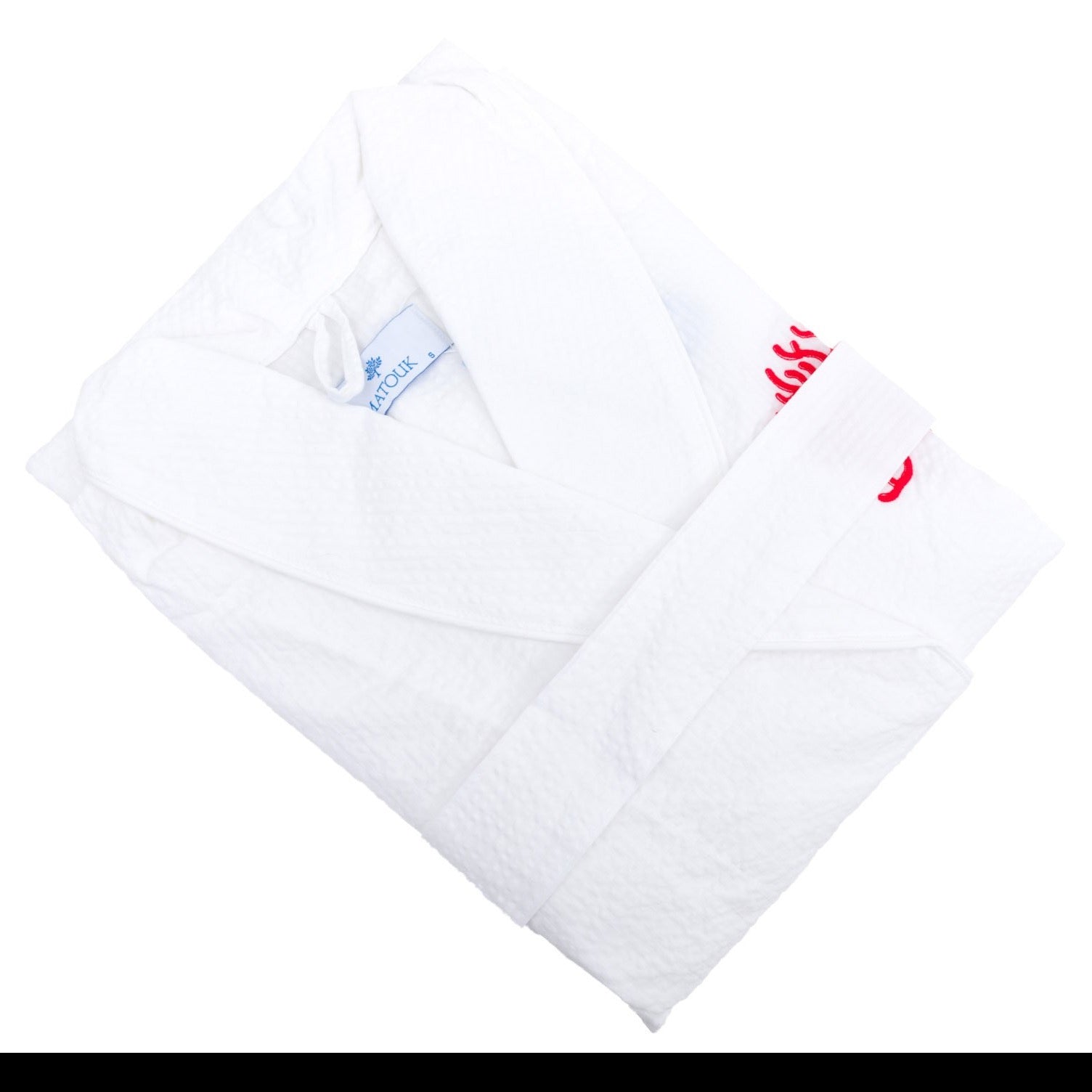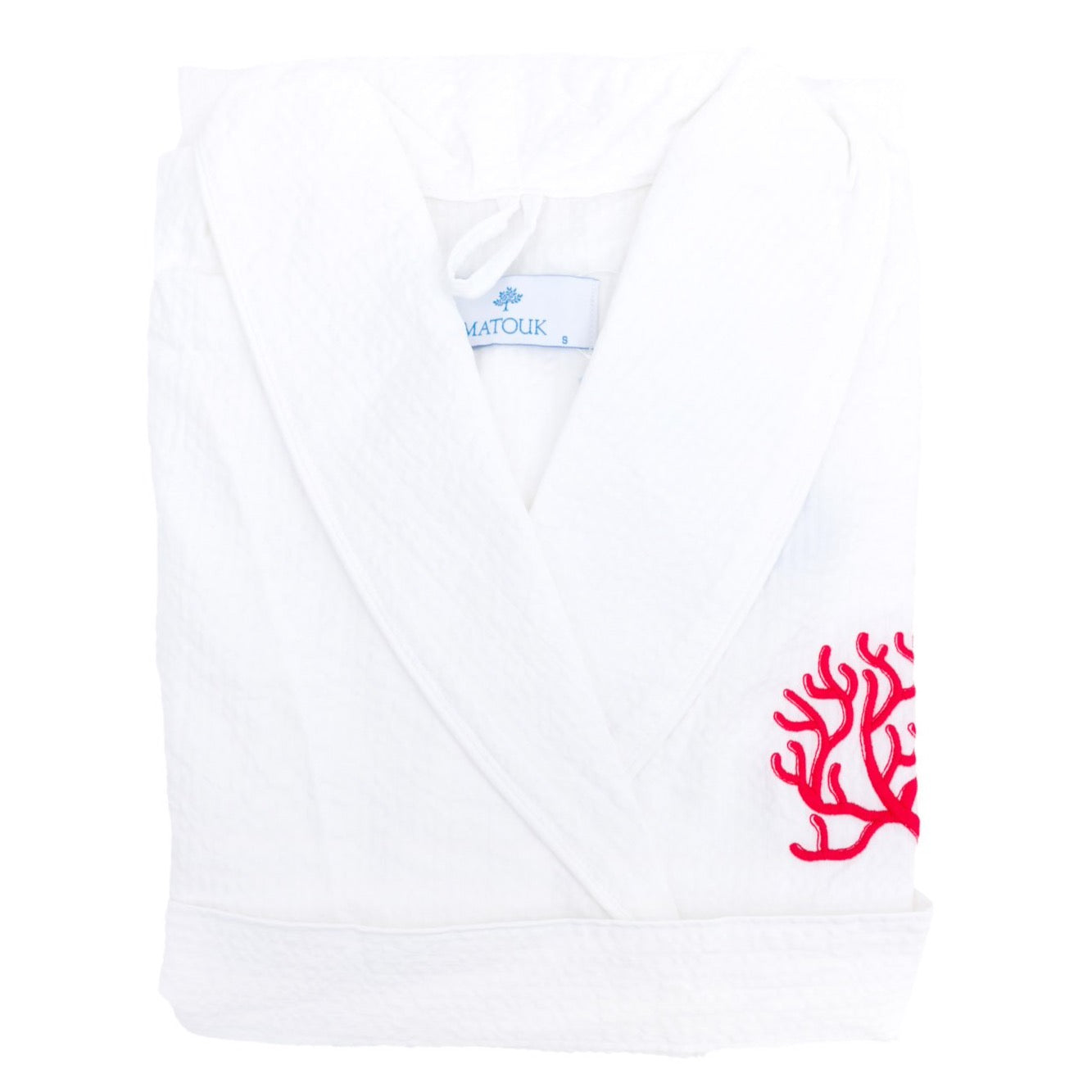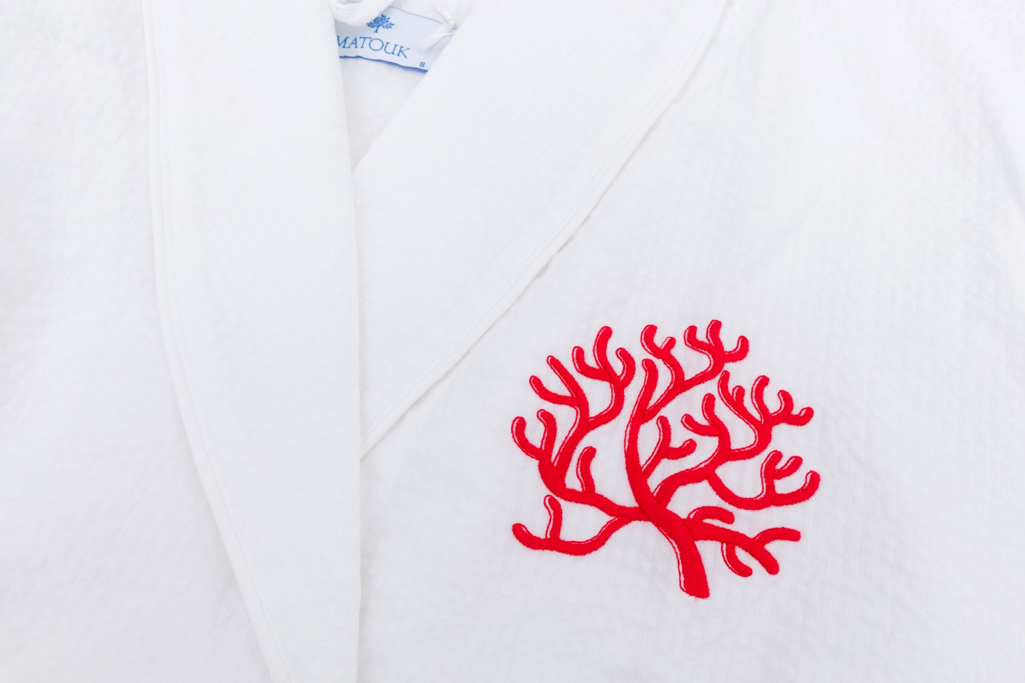 A collaboration between Via Coquina and Matouk, this summer-weight robe is crafted of pure white seersucker adorned with a coral motif and crisp white piping.