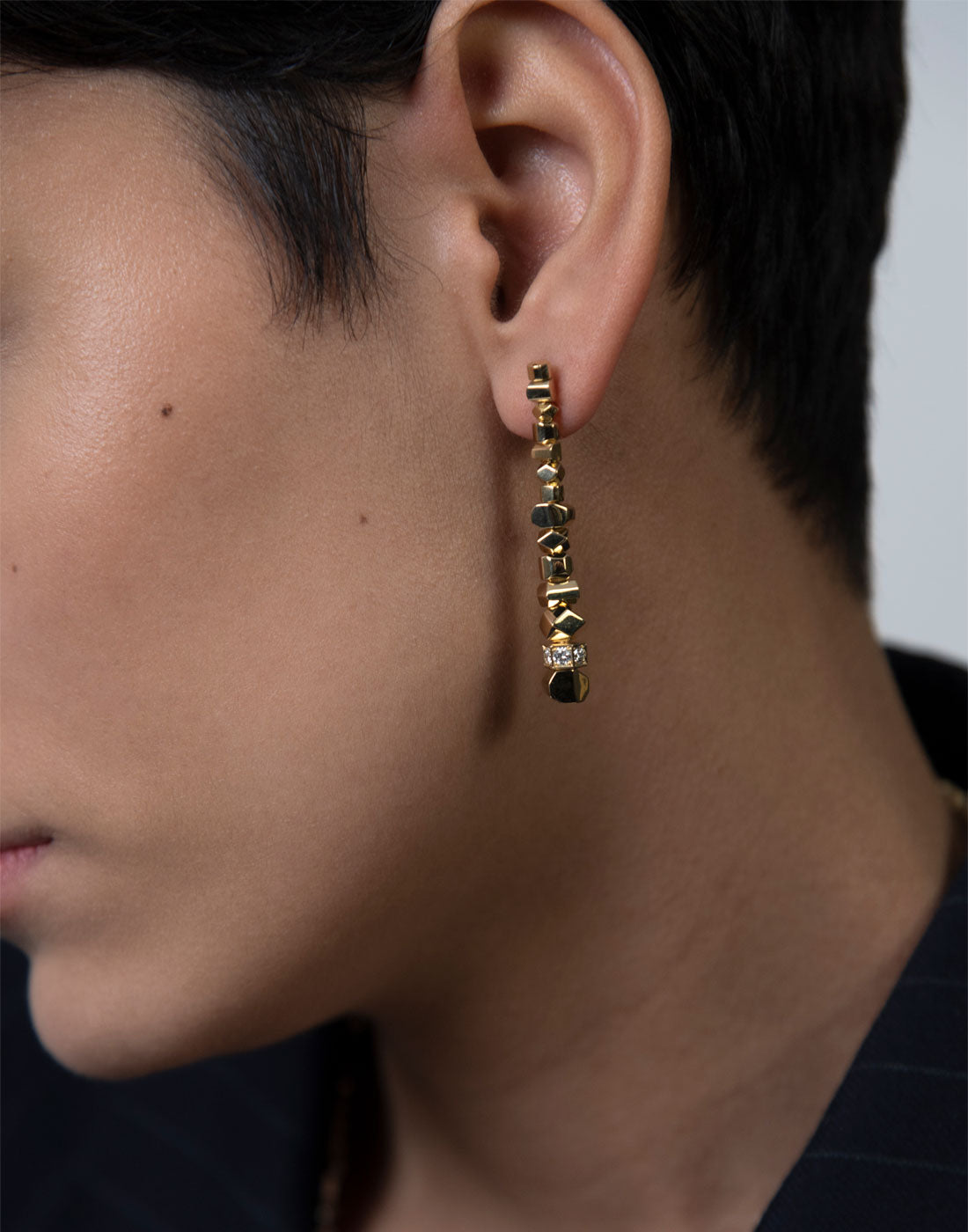 Long straight earring with gold irregular stone-like elements and snap Stud (Peruffo closure system).