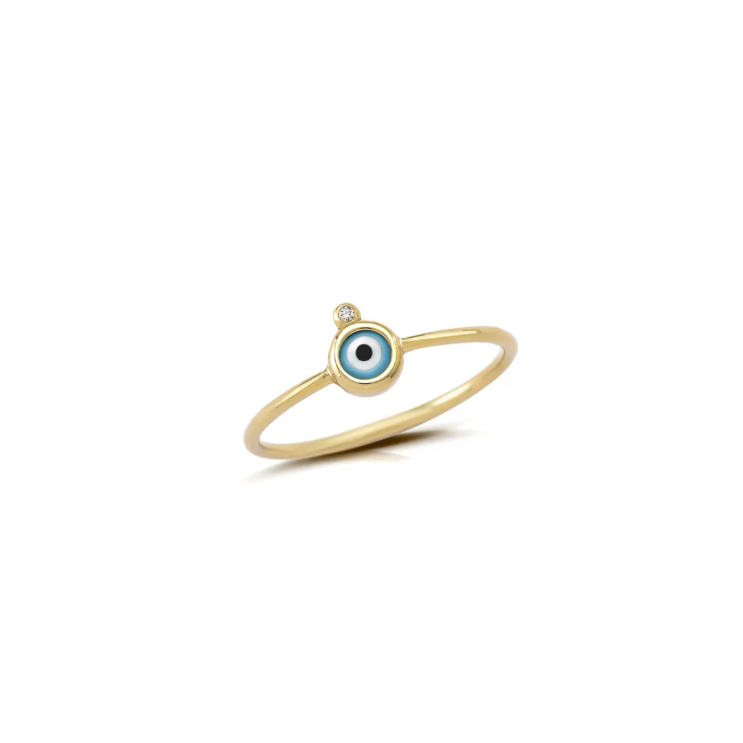 Delicate yet full of meaning, this 14K yellow gold ring features a miniature enamel evil eye accented with a single diamond above. Symbolizing clarity and protection, its minimalist design makes it perfect for layering or wearing alone as a subtle talisman of light and luck.