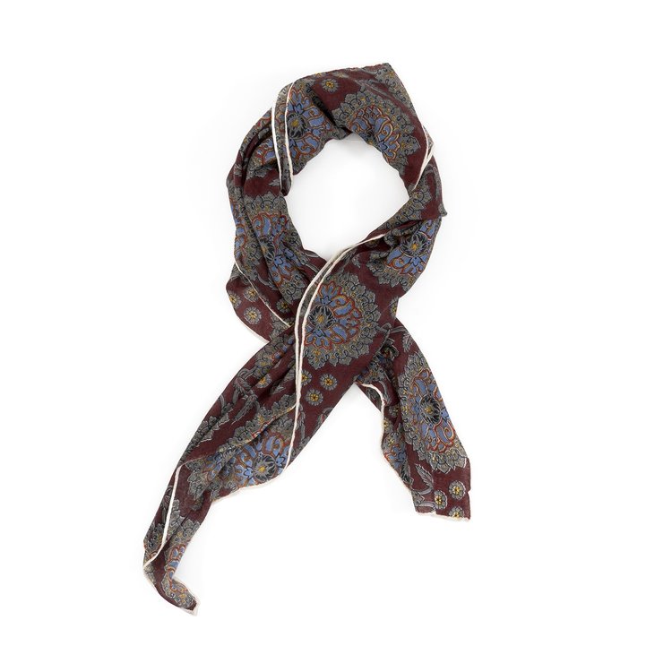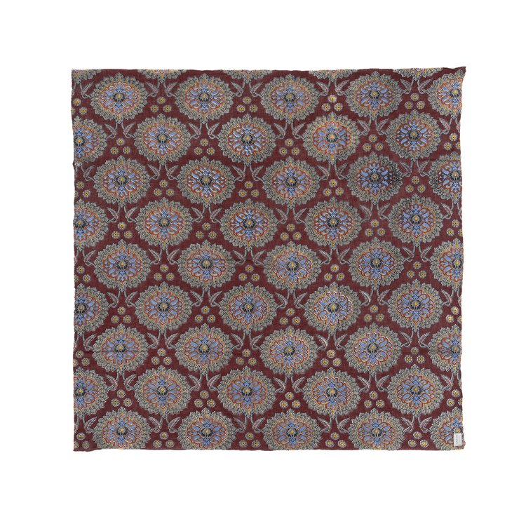 This collection of scarves is exquisitely hand-spun and hand-woven creating an even more luxurious suppleness of hand and texture. Block printed and finished with a hand stitched handkerchief hem.