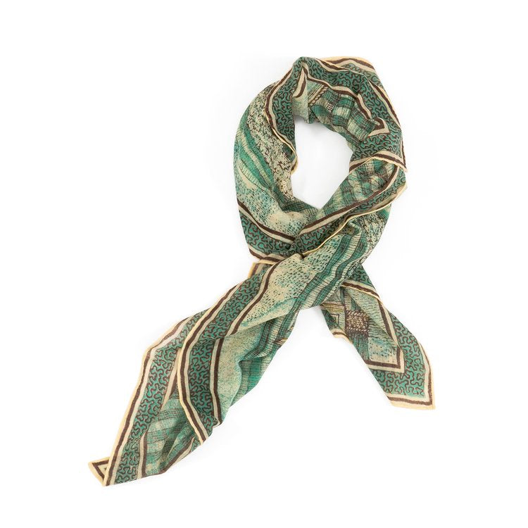 This collection of scarves is exquisitely hand-spun and hand-woven creating an even more luxurious suppleness of hand and texture. Block printed and finished with a hand stitched handkerchief hem. Part of the Lukas the Illustrator x SAVED Collection.