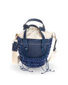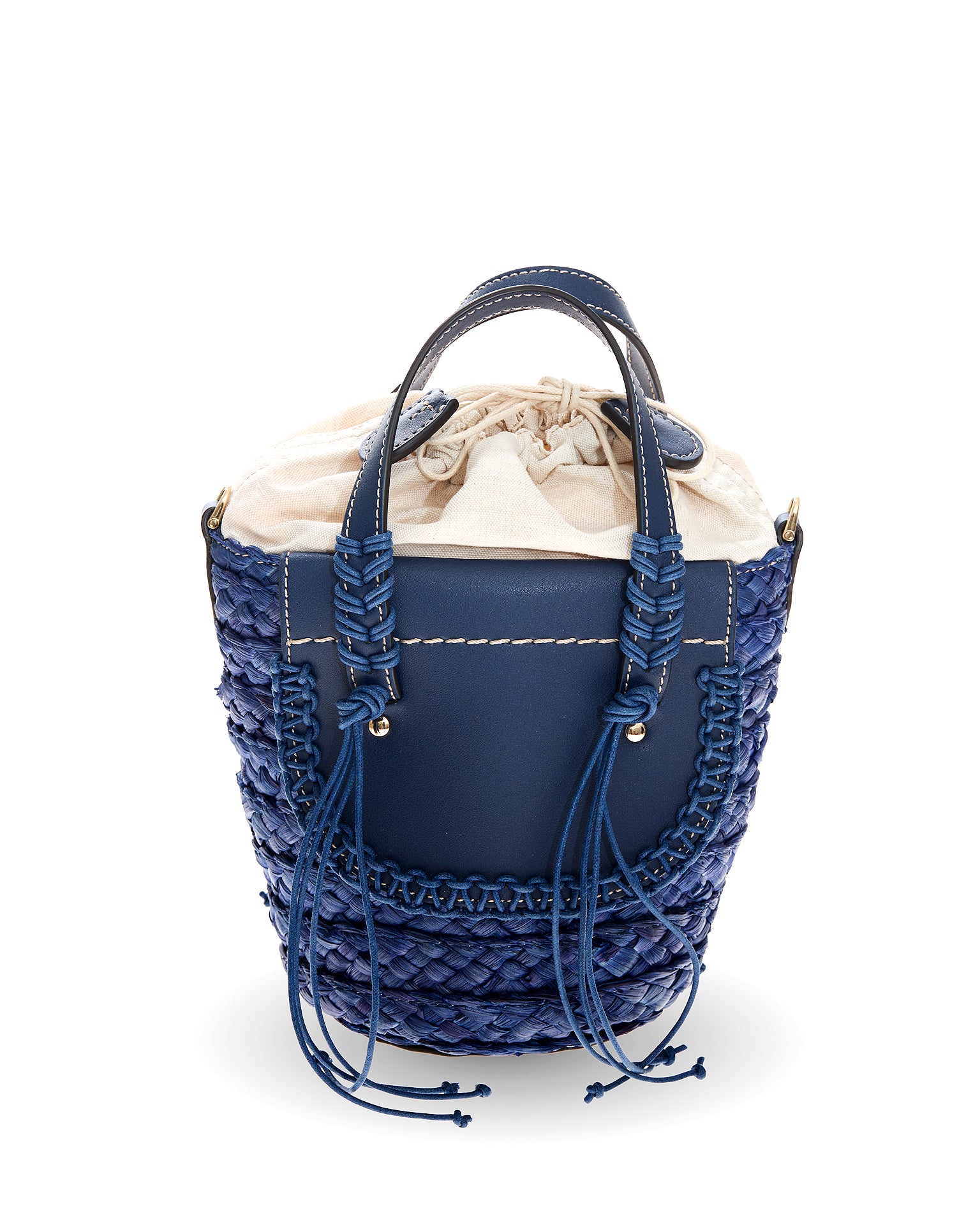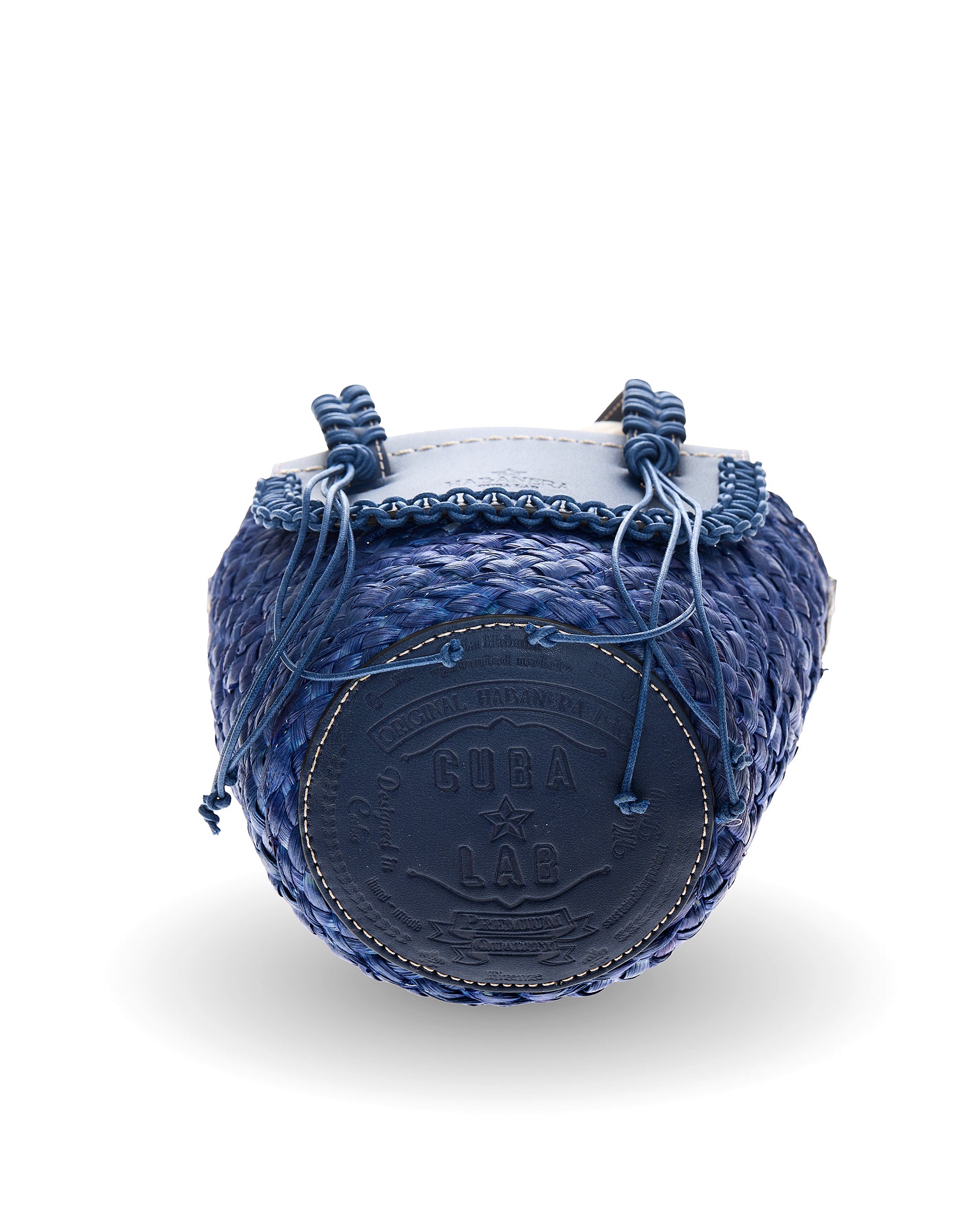 The Habanera Color Bloc Azucena bag has two leather handles and can be transformed into a crossbody. In this style the two ocean blue leather flaps and handles are decorated all around with waxed cords threading in blue tone, entirely handmade. The lining is made with beige linen color up-cycled fabric. All leather edges are hand painted and the basket is blue colored in tone. Inside a zip pocket. Hot stamped leather bottom.