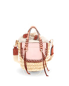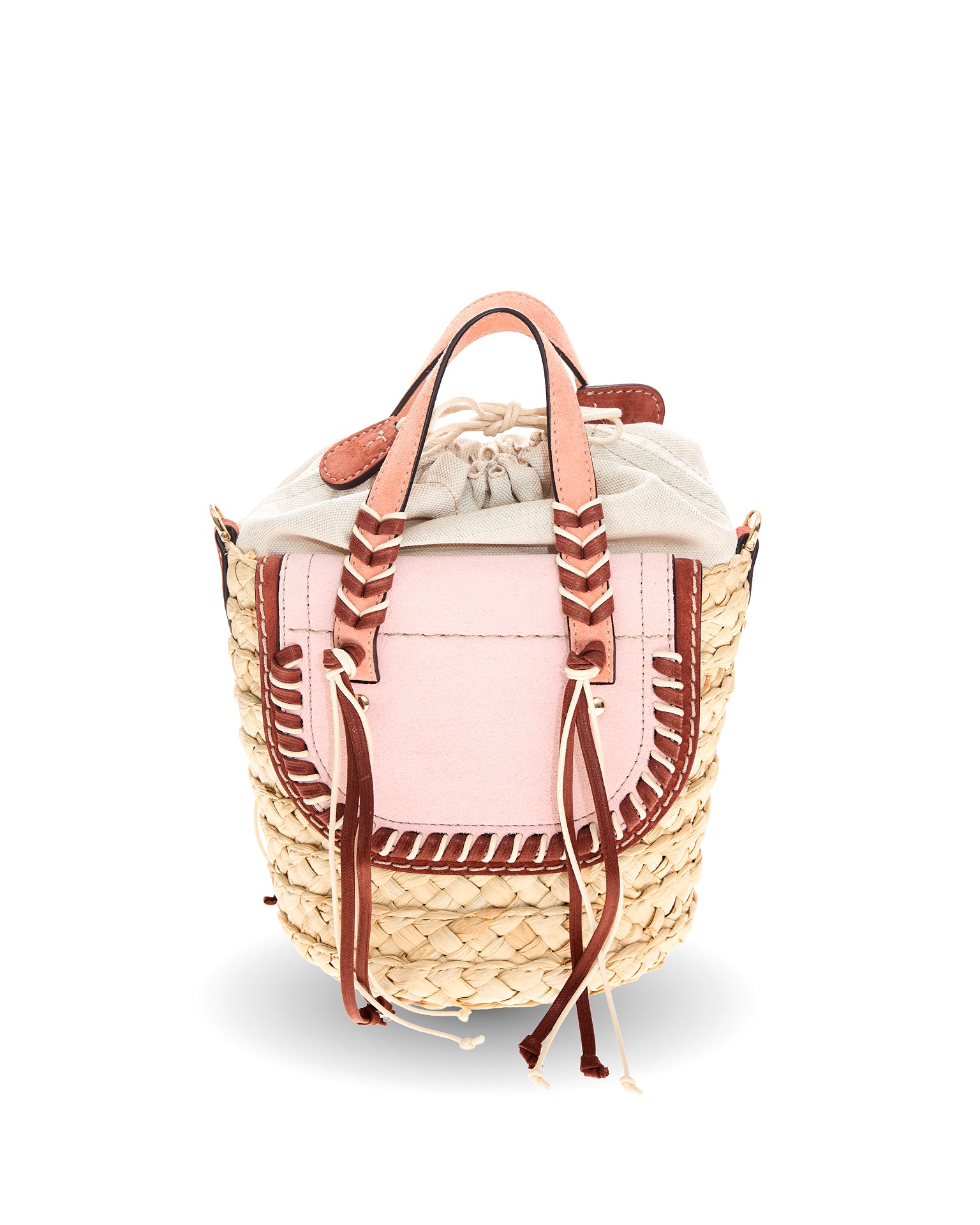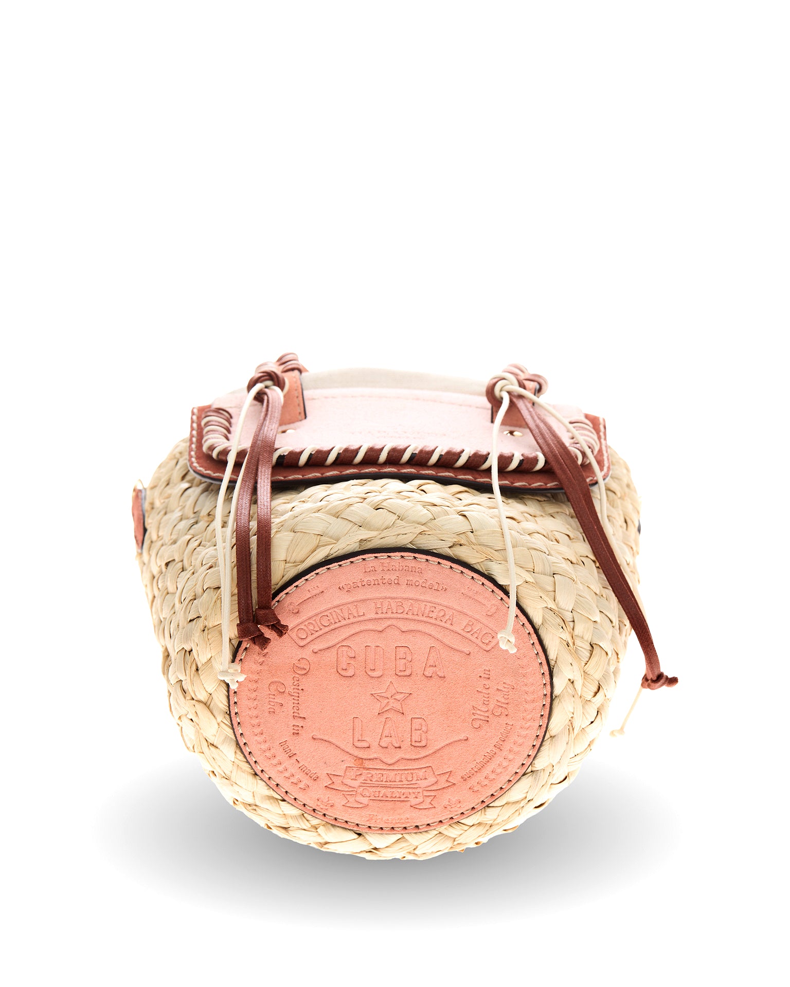 The Habanera bag has two leather handles and can be transformed into a crossbody. In this style the two light pink suede flaps and salmon handles are decorated with all around thick stitched edge and a waxed cord double threading in ruggine and ecru' color, entirely handmade. The lining is made with a beige linen up-cycled fabric. All leather edges are hand painted and the basket is in black color. Inside a zip pocket. Inside a zip pocket. Hot stamped leather bottom.