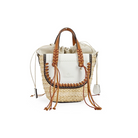 The Habanera bag has two leather handles and can be transformed into a crossbody. In this style the two white marble leather flaps and kenia handles are decorated with all around thick stitched edge and with a waxed cord double threading in brown and nut color, entirely handmade. The lining is made with a light brown linen up-cycled fabric. All leather edges are hand painted and the basket is in natural corn color. Inside a zip pocket.