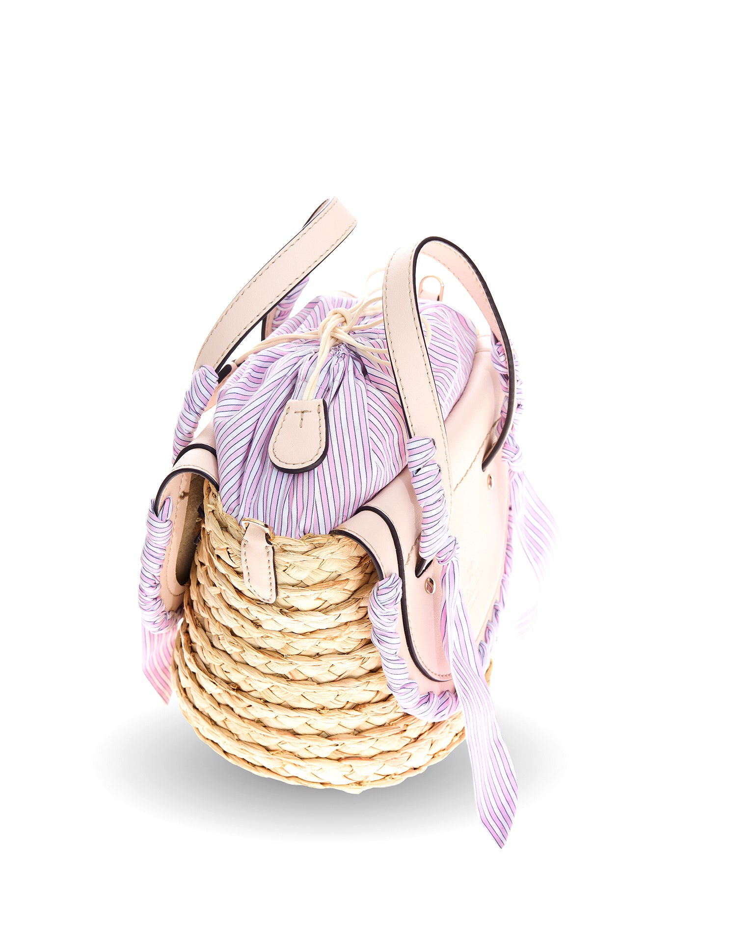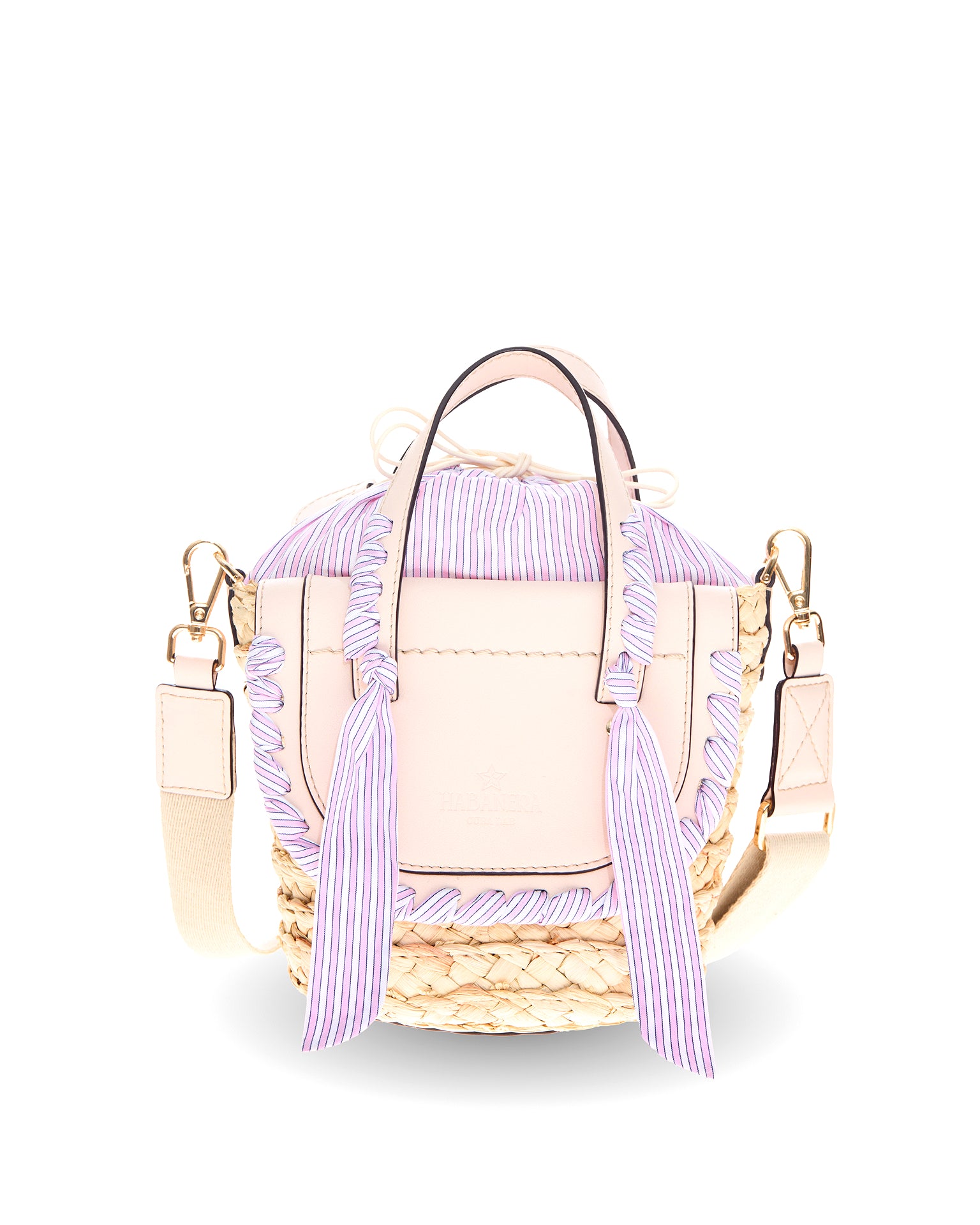 The Habanera Popeline bag has two leather handles and can be transformed into a crossbody. In this style the two candy pink leather flaps and handles are decorated with a upcycled extra fine popeline cotton fabric tailoring handmade ribbon, in pink and white stripes color, same of the lining. Inside a zip pocket. All leather edges are hand painted and the basket is in natural corn color. Hot stamped leather bottom.