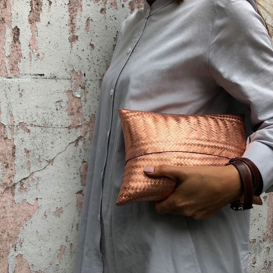 This woven copper clutch was inspired by the traditional copper wraps woven in Oaxaca. Handmade by Oaxacan artisans.