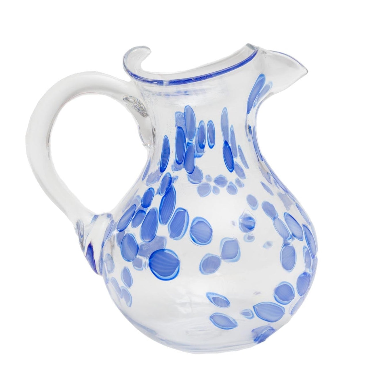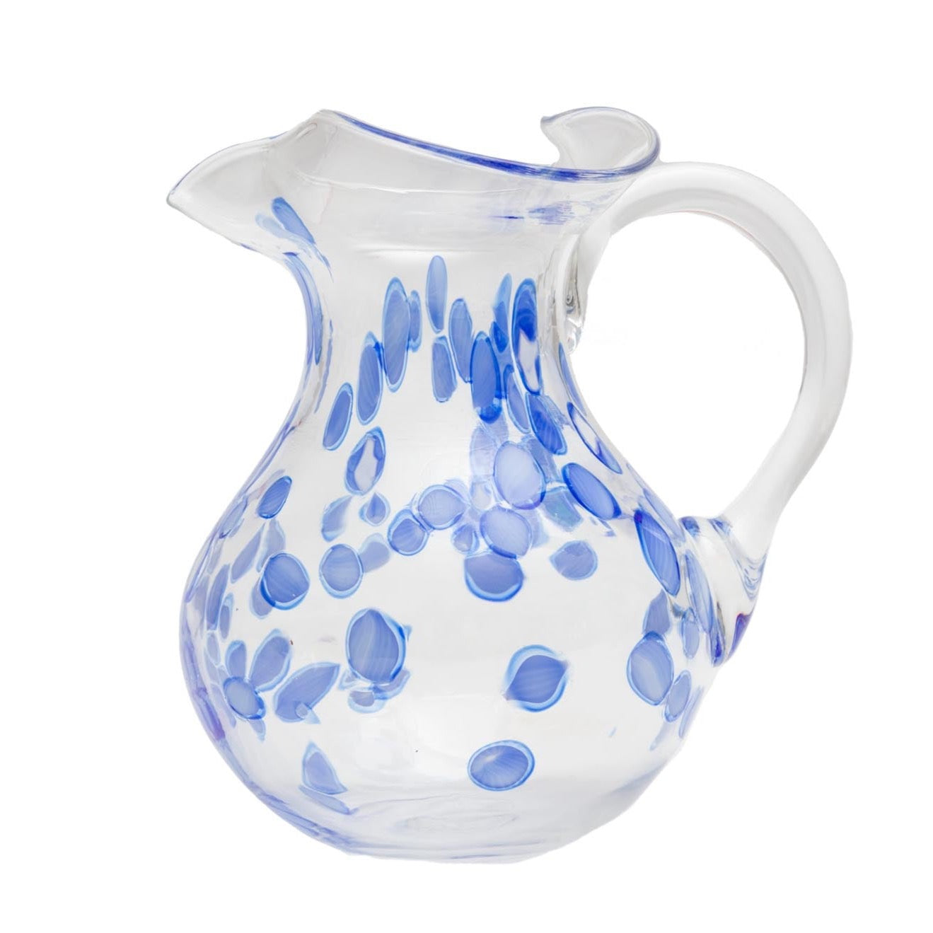 These festive tumblers are crafted by master glassbowers on the island of Murano. The pattern is created by adding colored glass chips to the molten glass before hand-blowing each piece. Each pitcher is a unique work of art and will have natural variations.