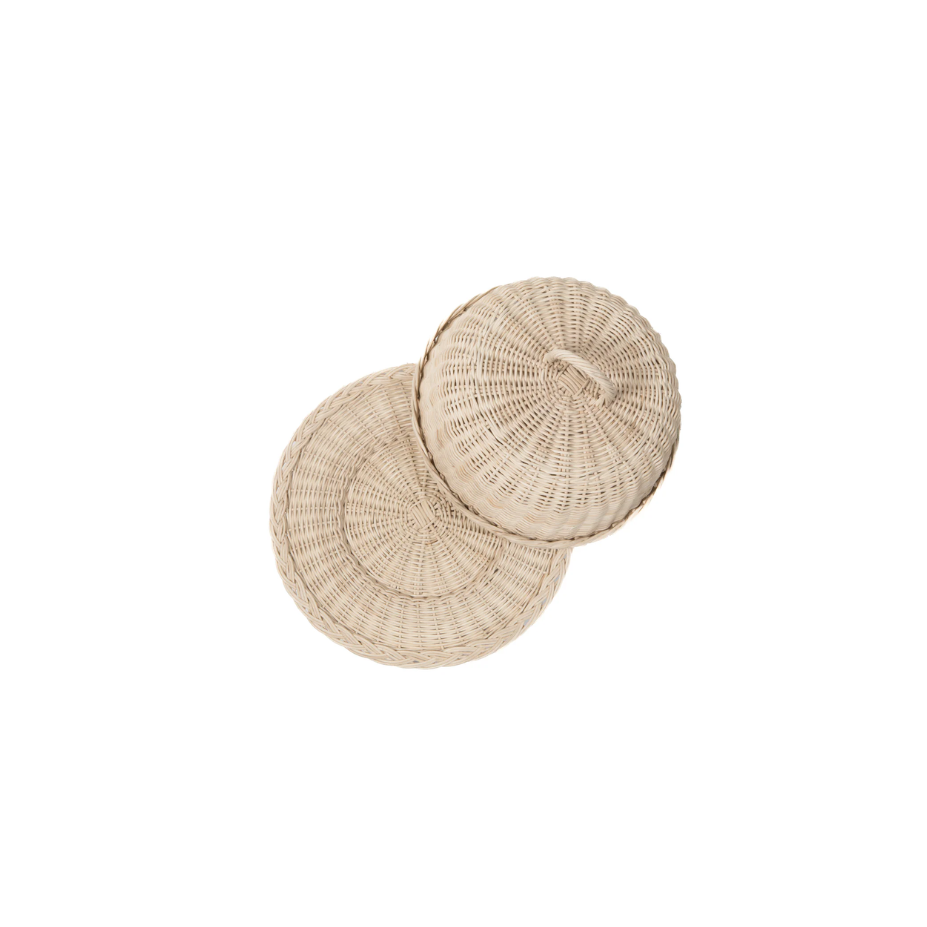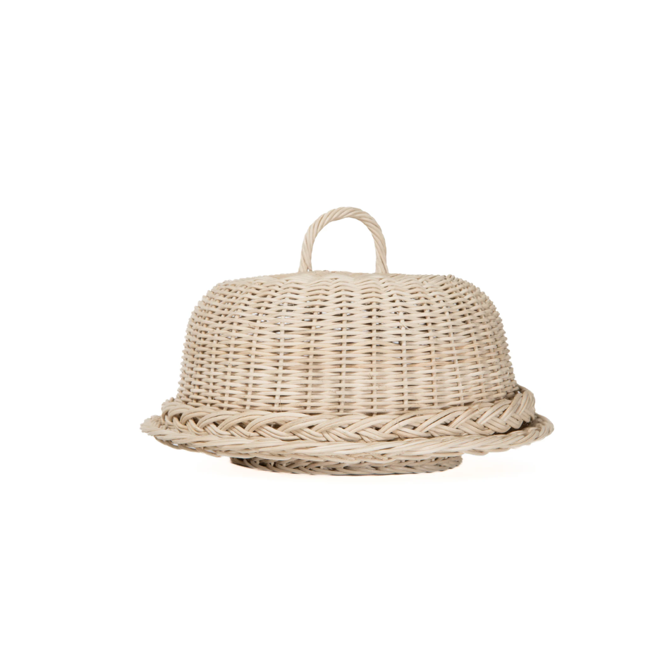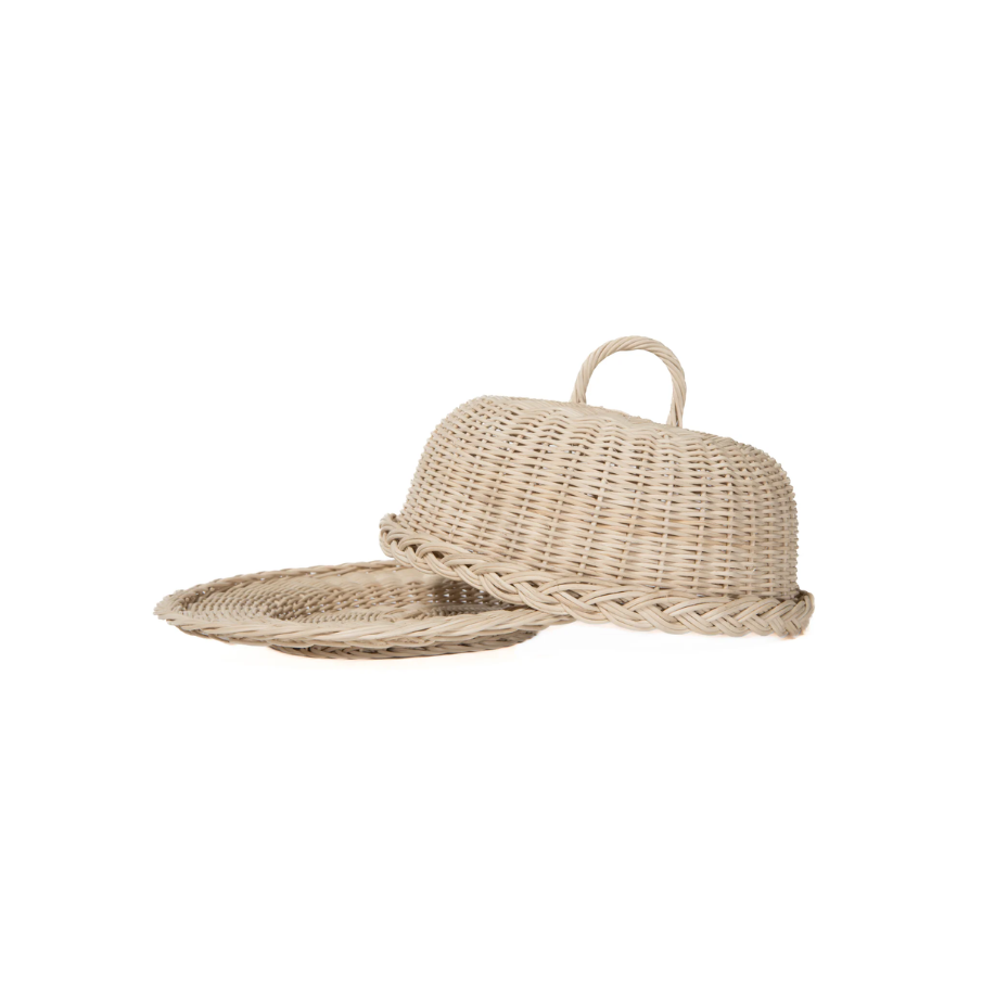 This handwoven rattan cloche with matching tray is perfect for serving cheese, fruit, or pastries.