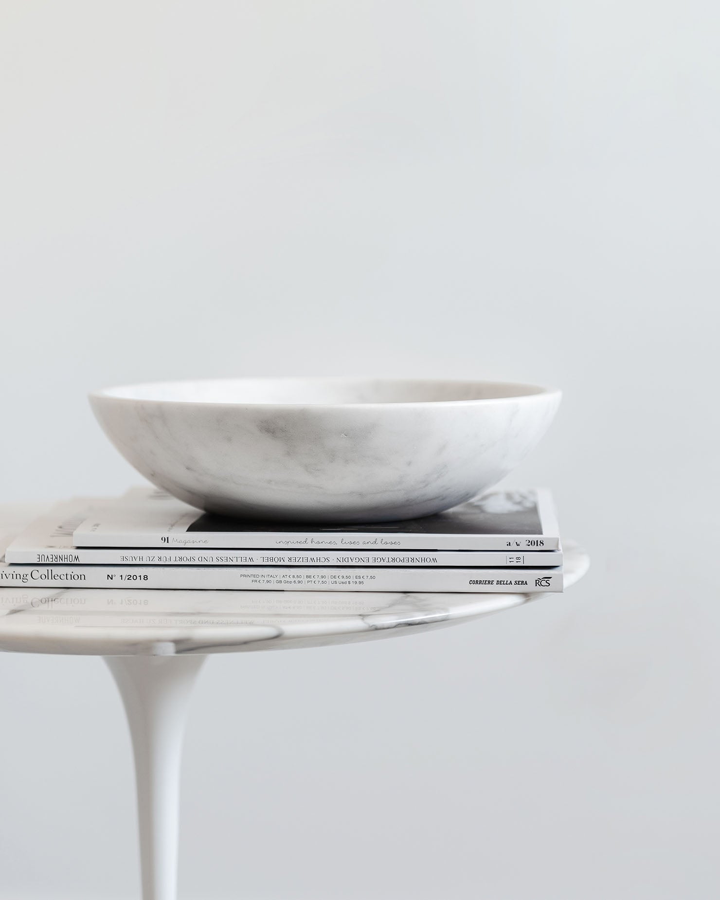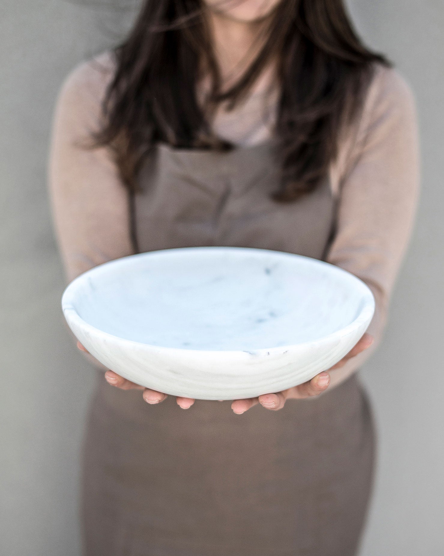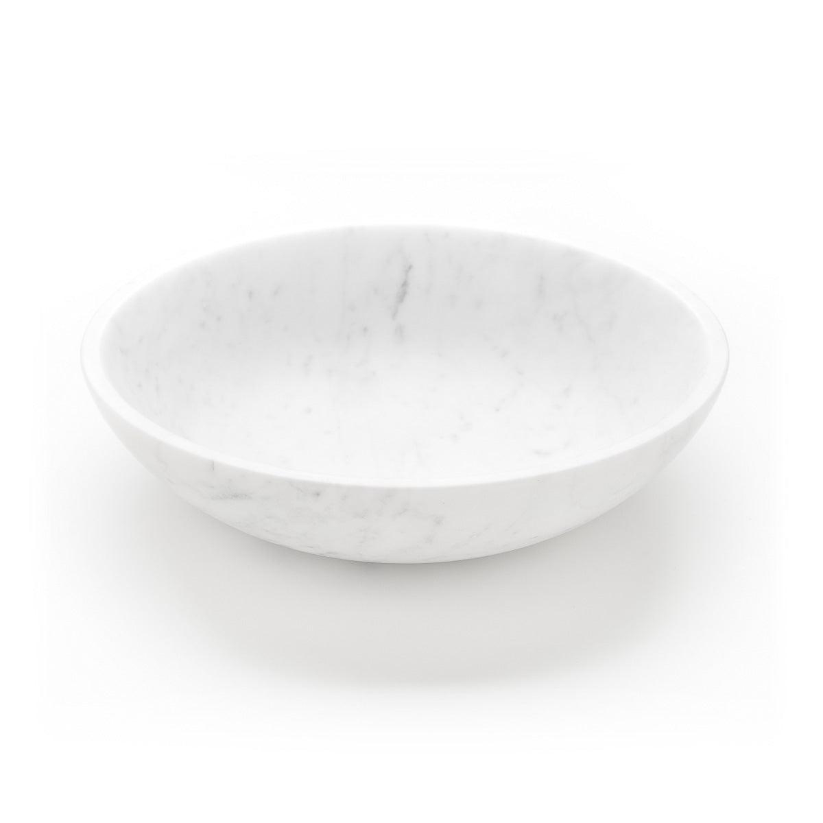The bowl in white Carrara marble is finished by hand in our workshops in Finale Ligure.
