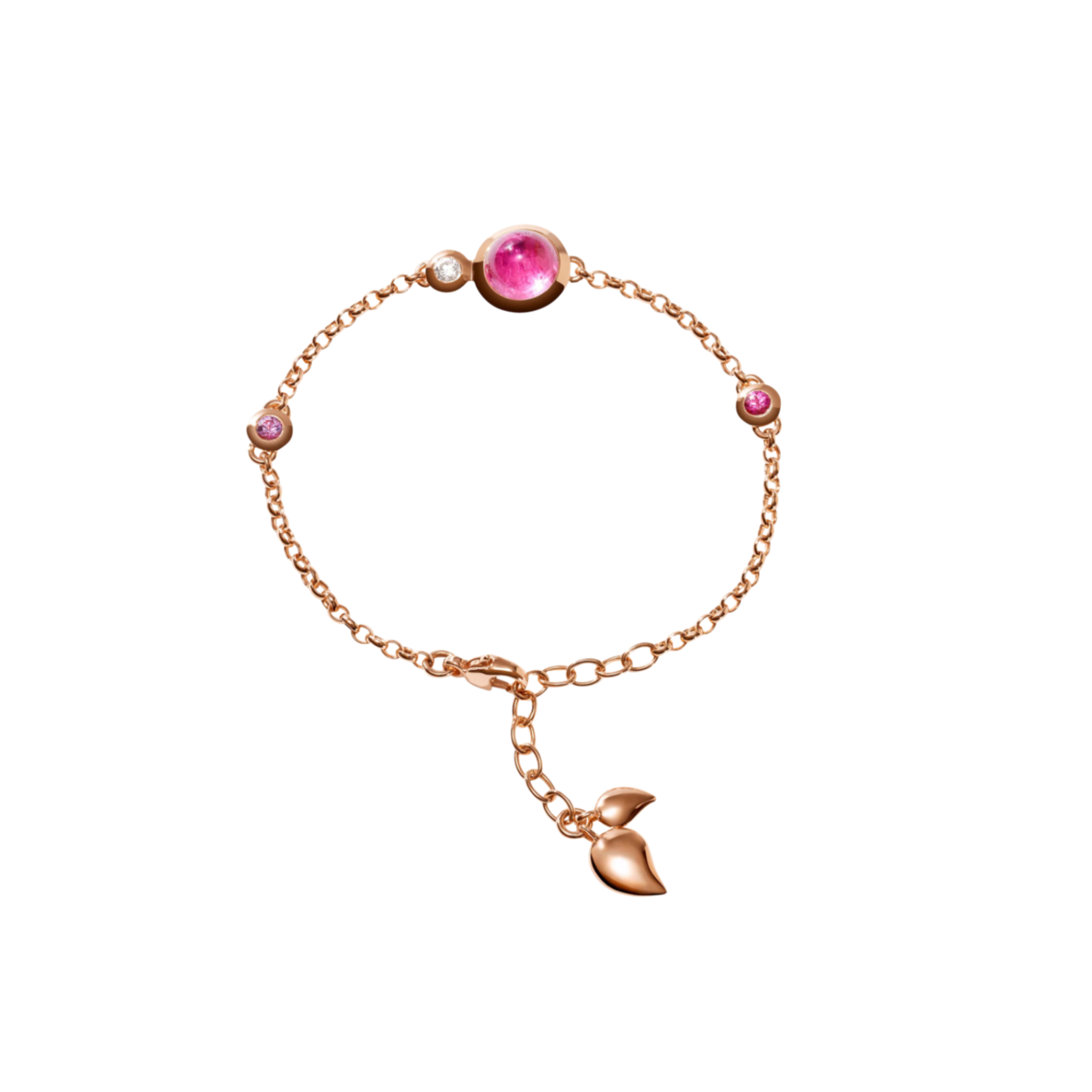The BOUTON Mini Chain bracelet is set with a cabochon-cut pink tourmaline, a pink quartz, a spinel, and a white diamond. This beautiful bracelet in the 'Blush' color story is perfect for everyday wear, both individually and layered. Suitable for all wrists.
