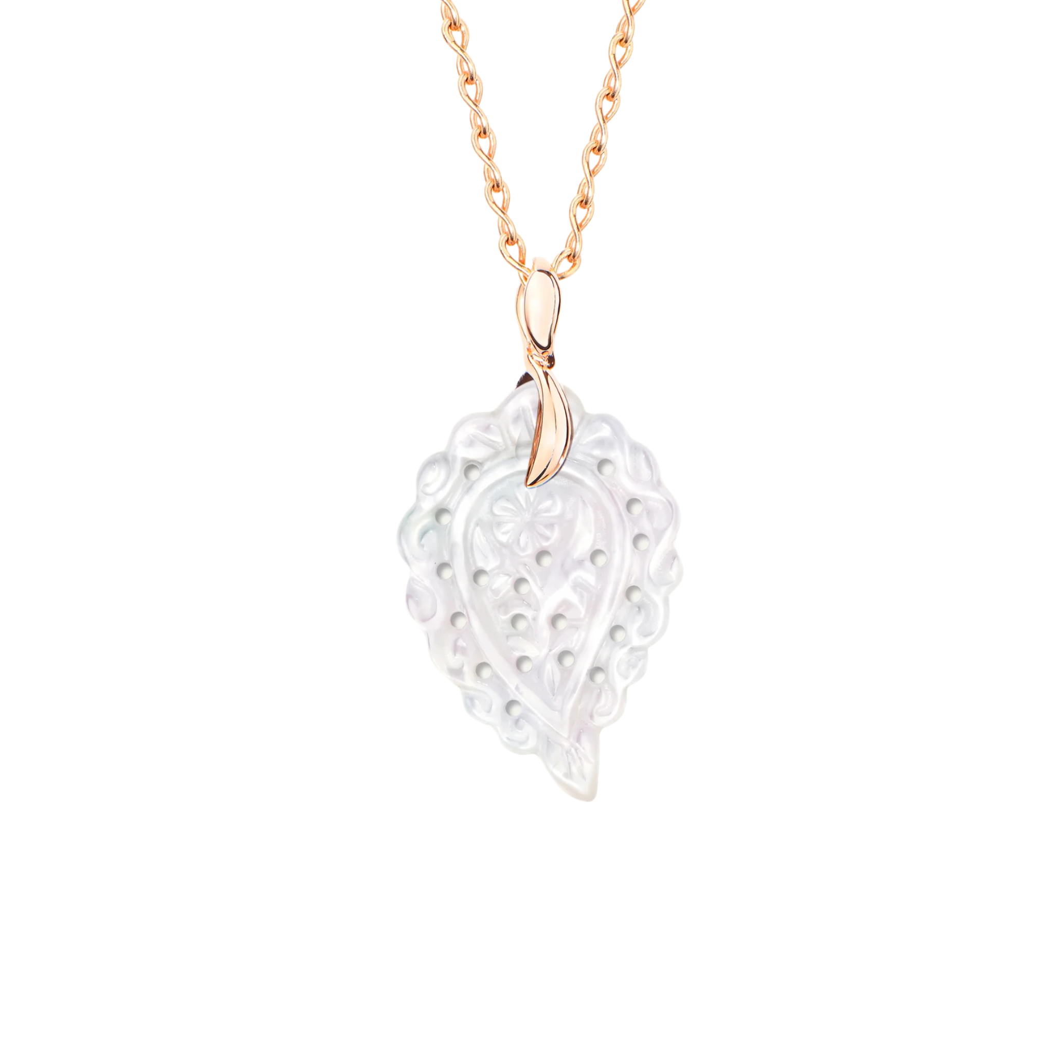 The India Small Pendant in 18K gold features artfully carved Mother of Pearl, showcasing soft, iridescent tones in an elegant leaf shape. Designed to dangle delicately from a chain, it’s a beautiful everyday favorite that adds a touch of sophistication to any look. Perfect for adding dimension to a layered look.