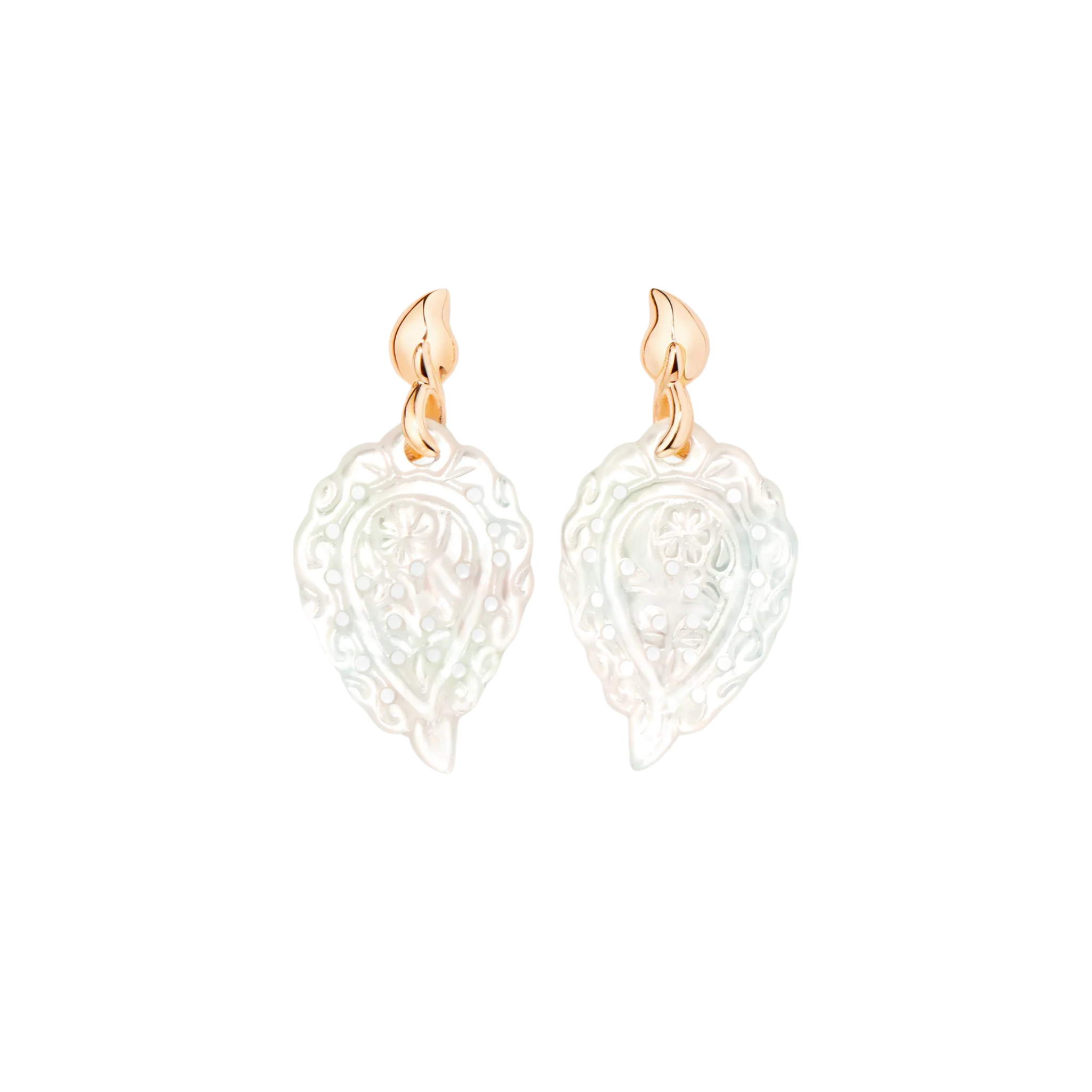Meticulously handcrafted, the INDIA Earrings in 18K gold feature artfully carved Mother of Pearl leaves, showcasing soft, iridescent tones that frame the face beautifully. Suspended from an iconic drop-shaped stud, these lightweight earrings bring a touch of luminous charm.