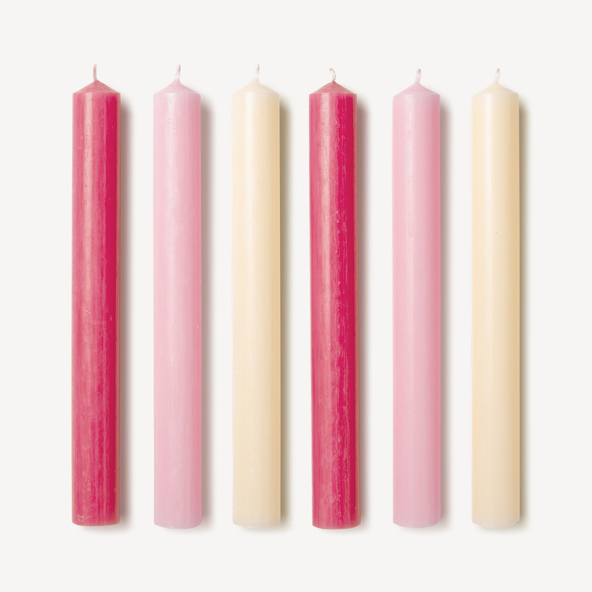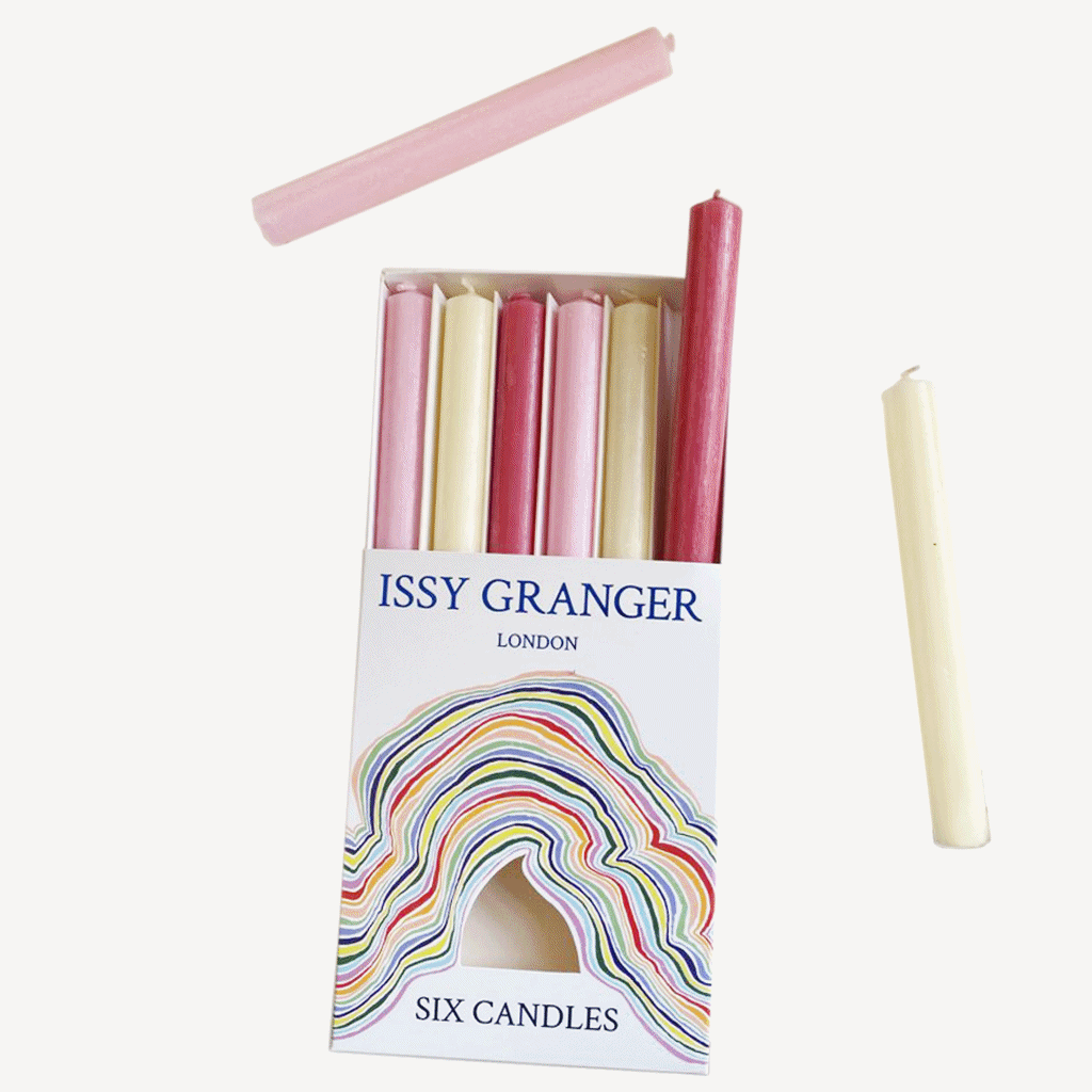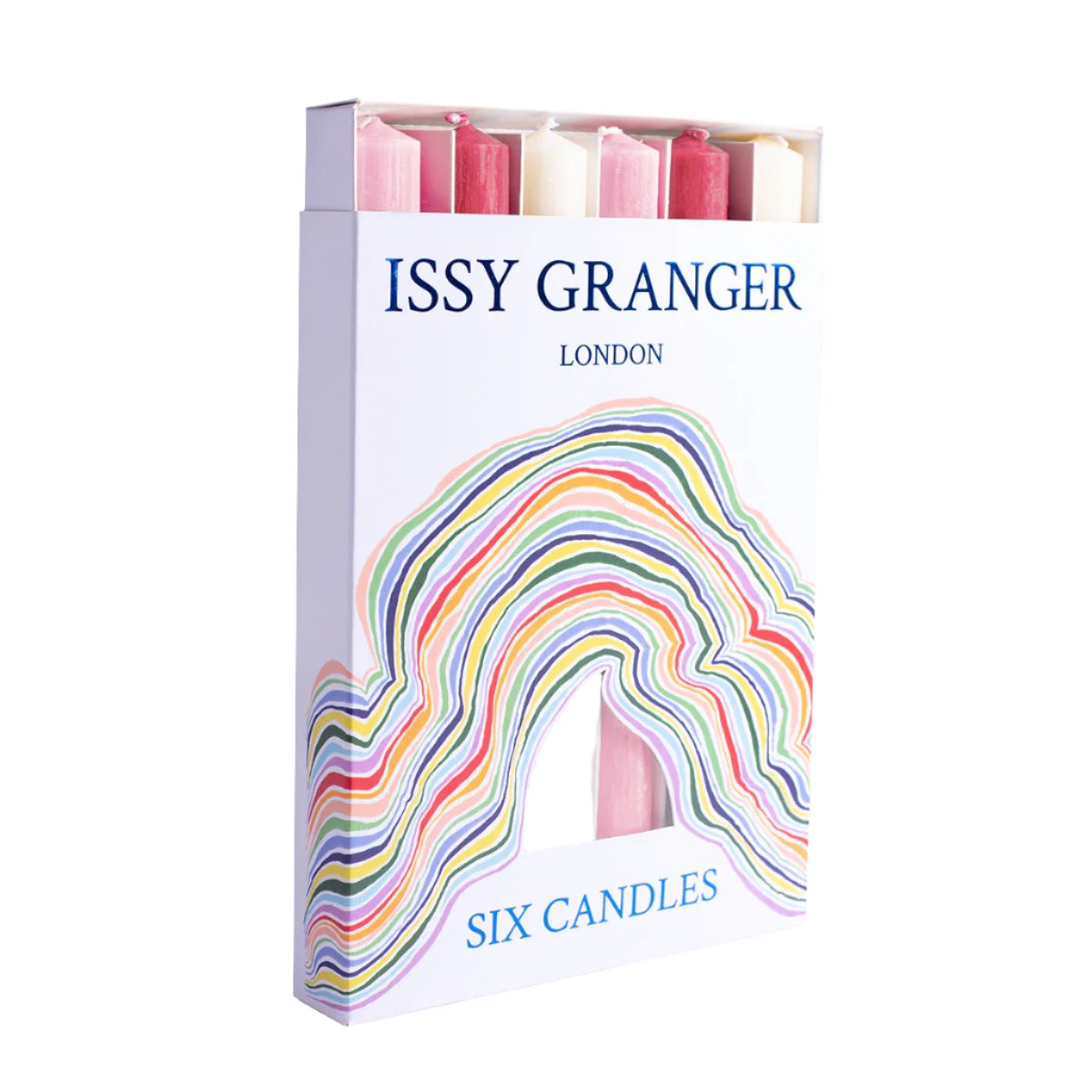 Issy Granger's colorful chic Dinner Candles are hand drawn using traditional techniques on the South West coast of England. This technique gives the candles a unique mottled appearance. The candles are hand packaged in an Issy Granger candles box and come in a set of six.