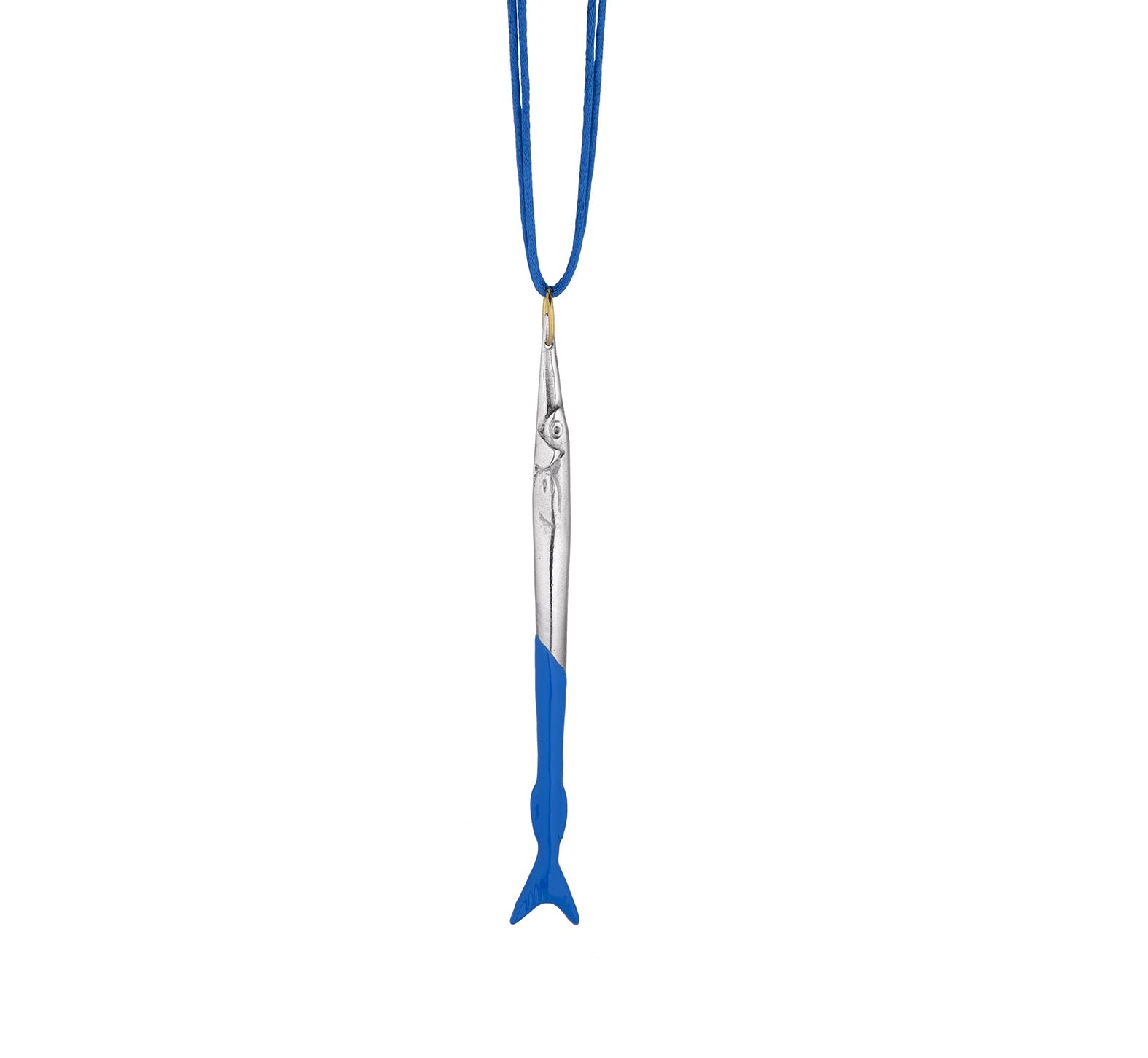 Inspired by the fish of the Aegean sea, this pendant makes a bold statement! The realistic, shimmering fish hangs from a double silk cord.