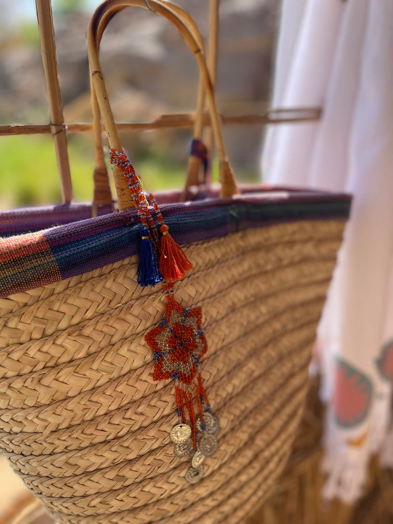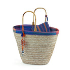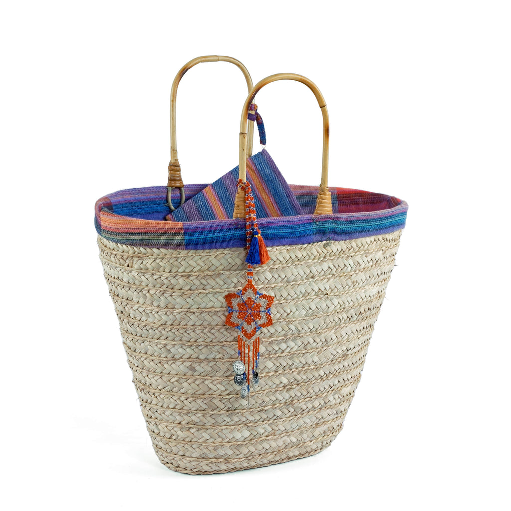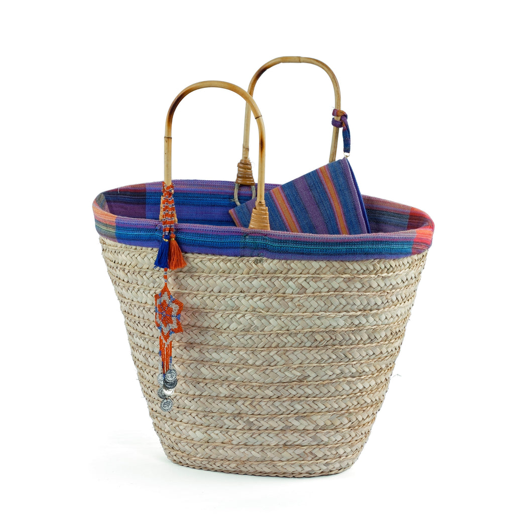 The perfect beach accessory. This straw bag is lined with a colourful handwoven textile made in Aswan. Each lining fabric is unique and comes in various summery colours. With lovely bamboo handles.