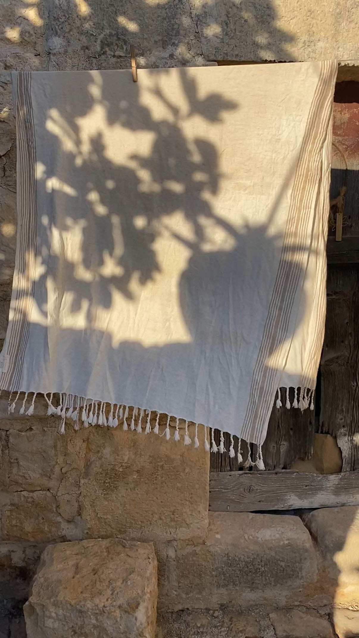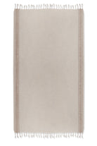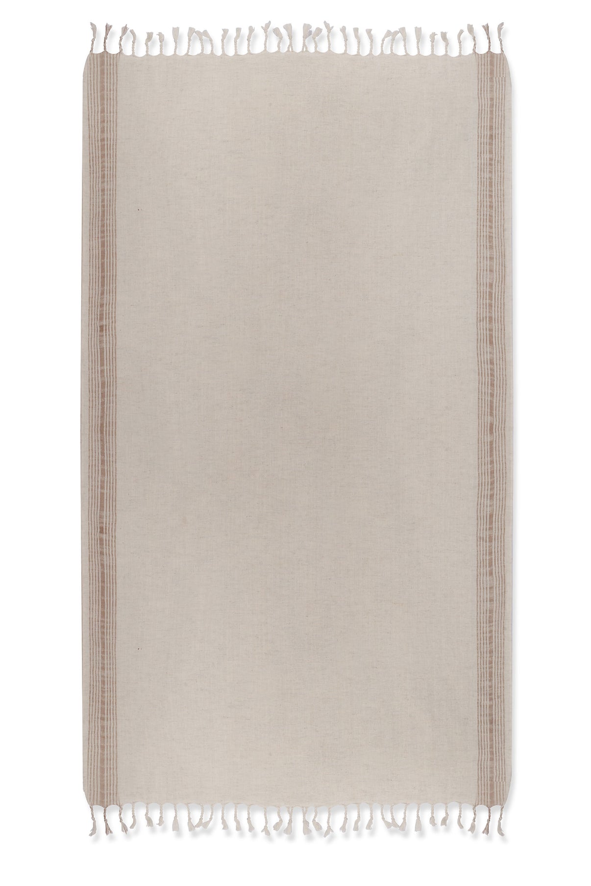 Luxurious fast drying organic cotton & linen blend. Vertical sand stripes on each side of the neutral fabric with fringes.