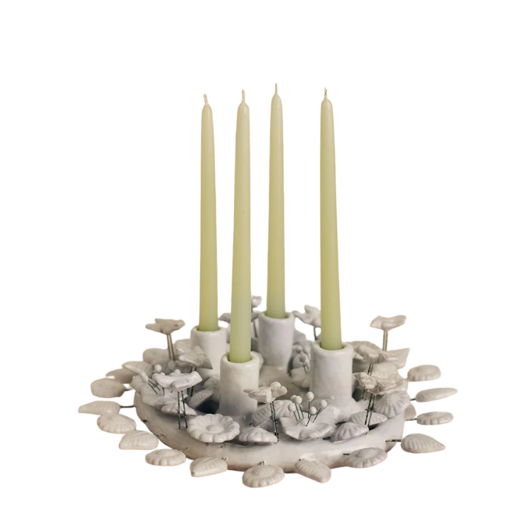 Our ceramic advent wreath made from glazed terracotta in Metepec is a beautiful example of the pastillaje technique with its many leaves, flowers and doves. It features 4 candles, one to light on each week of December.