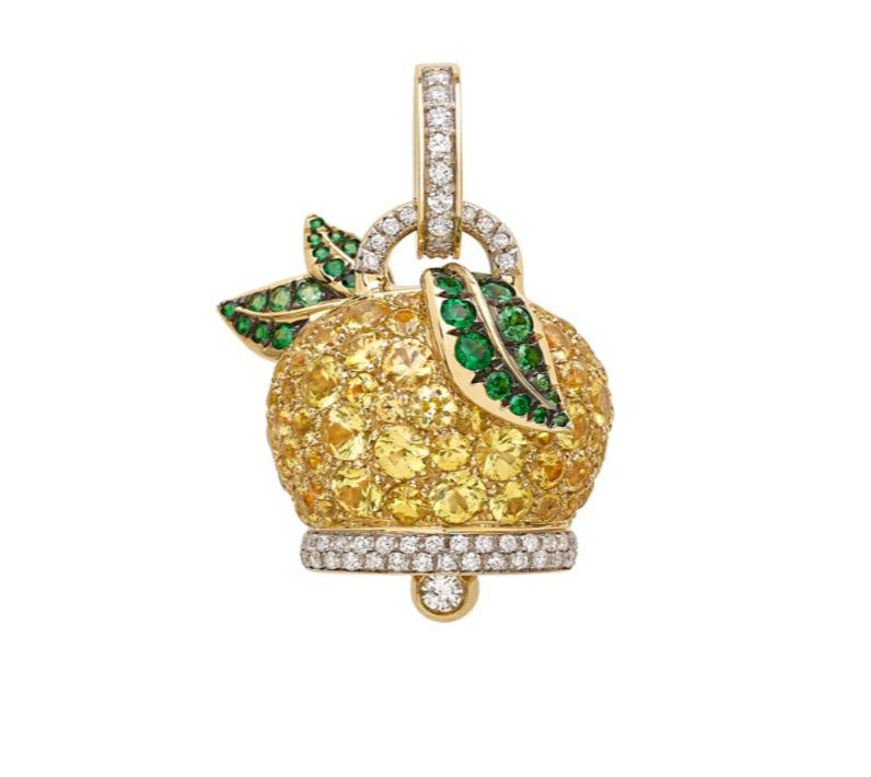 Large Lemon Campanella charm in 18K yellow gold with diamonds, yellow sapphires, and tsavorites.