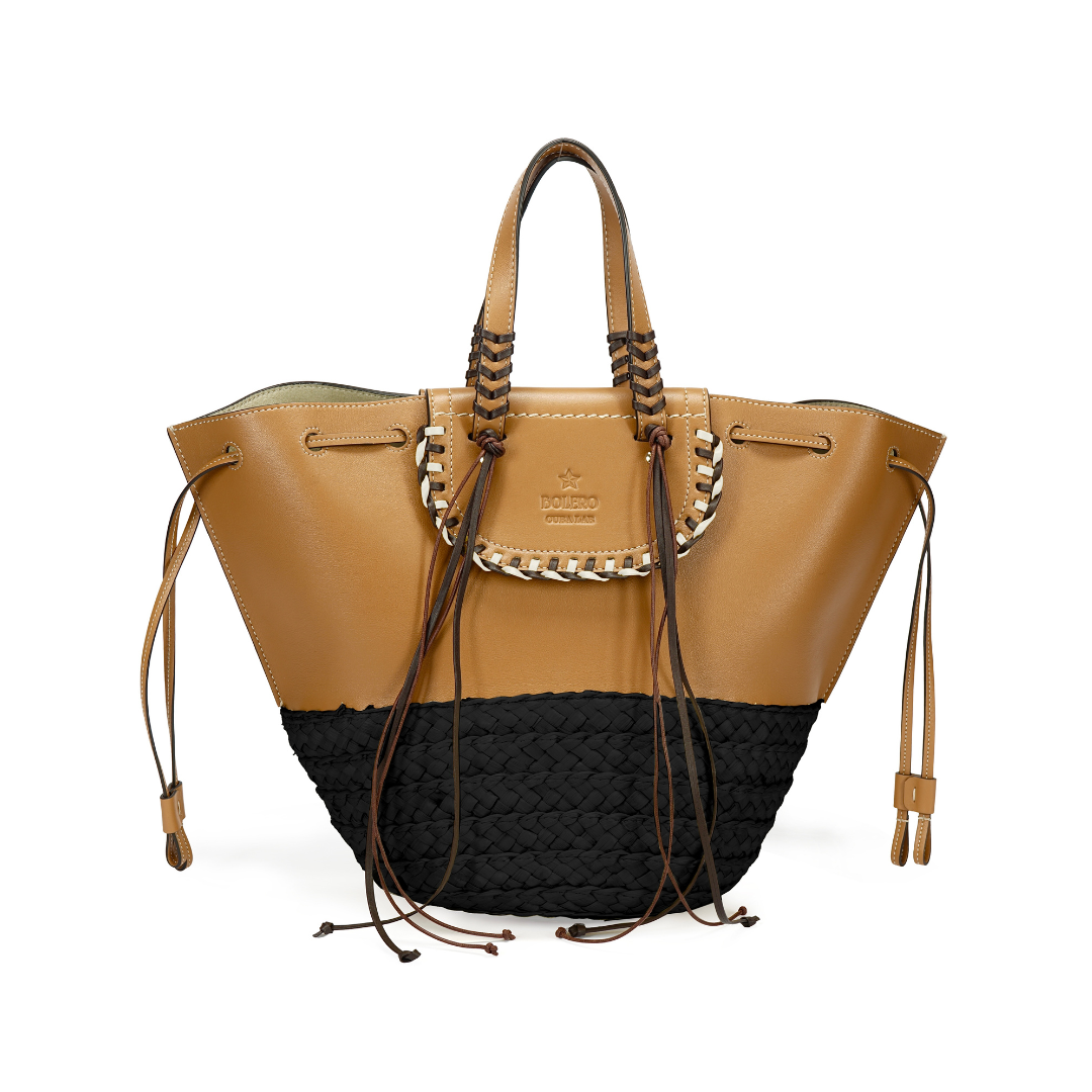 Bolero bag is a shopping tote with double hands which can be transformed into a crossbody. The bag is constructed unlined, with a part in Kenia color calfskin and one in corn straw with a stamped leather bottom. The two leather flaps and the handles are decorated with threads made entirely by hand in off-white and ebony colored leather. The bag can be closed with the leather drawstring laces, and have a flat leather pocket inside. All leather edges are hand painted, and the basket is in black corn color.