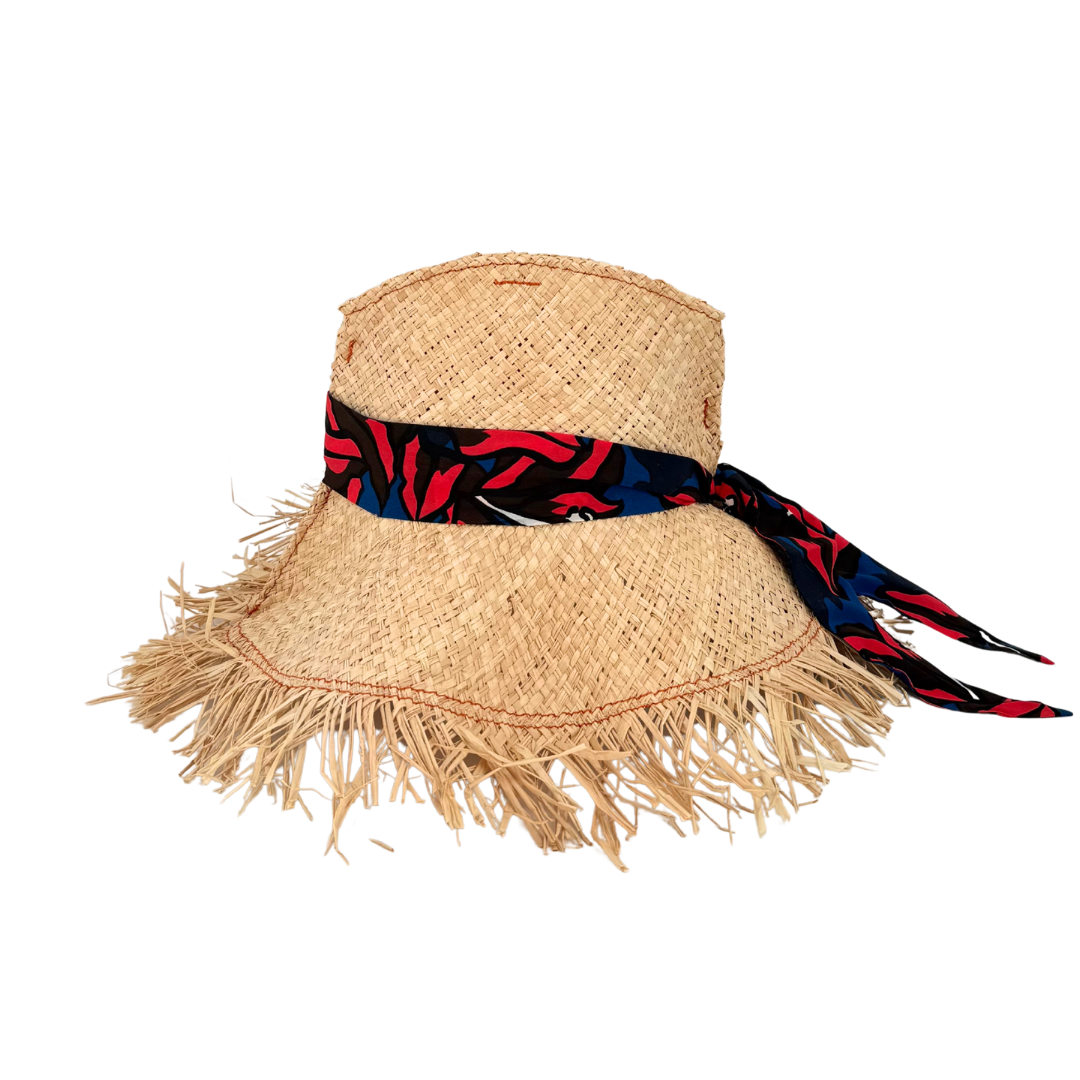 Pamela hat in natural woven raffia, hand-ironed on a shape with contrasting saddlery stitching, decorated with hand-sewn silk ribbon.