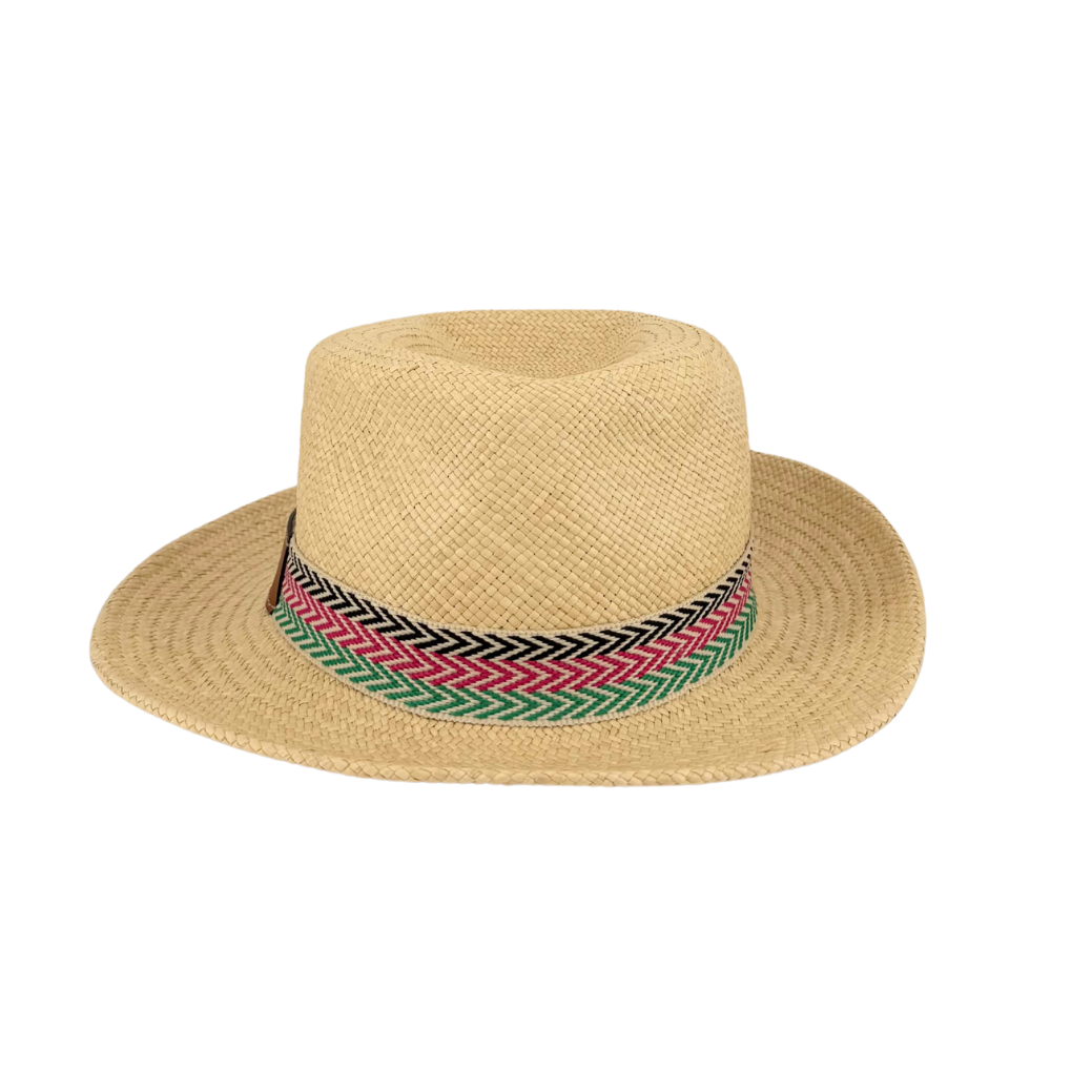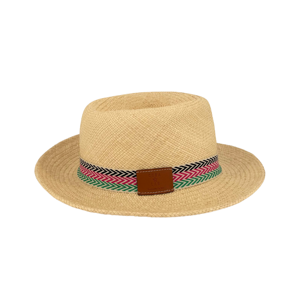Fedora hat in natural woven straw, hand-ironed on a shape with a ribbon in Cotton and Linen herringbone in tricolors blue, green and fucsia. Hand-sewn label in kenia color genuine leather.