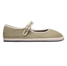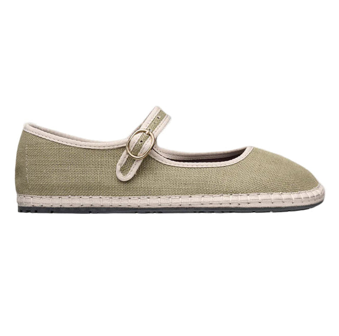 • Linen Mary Jane in green with beige piping and buckle closure.