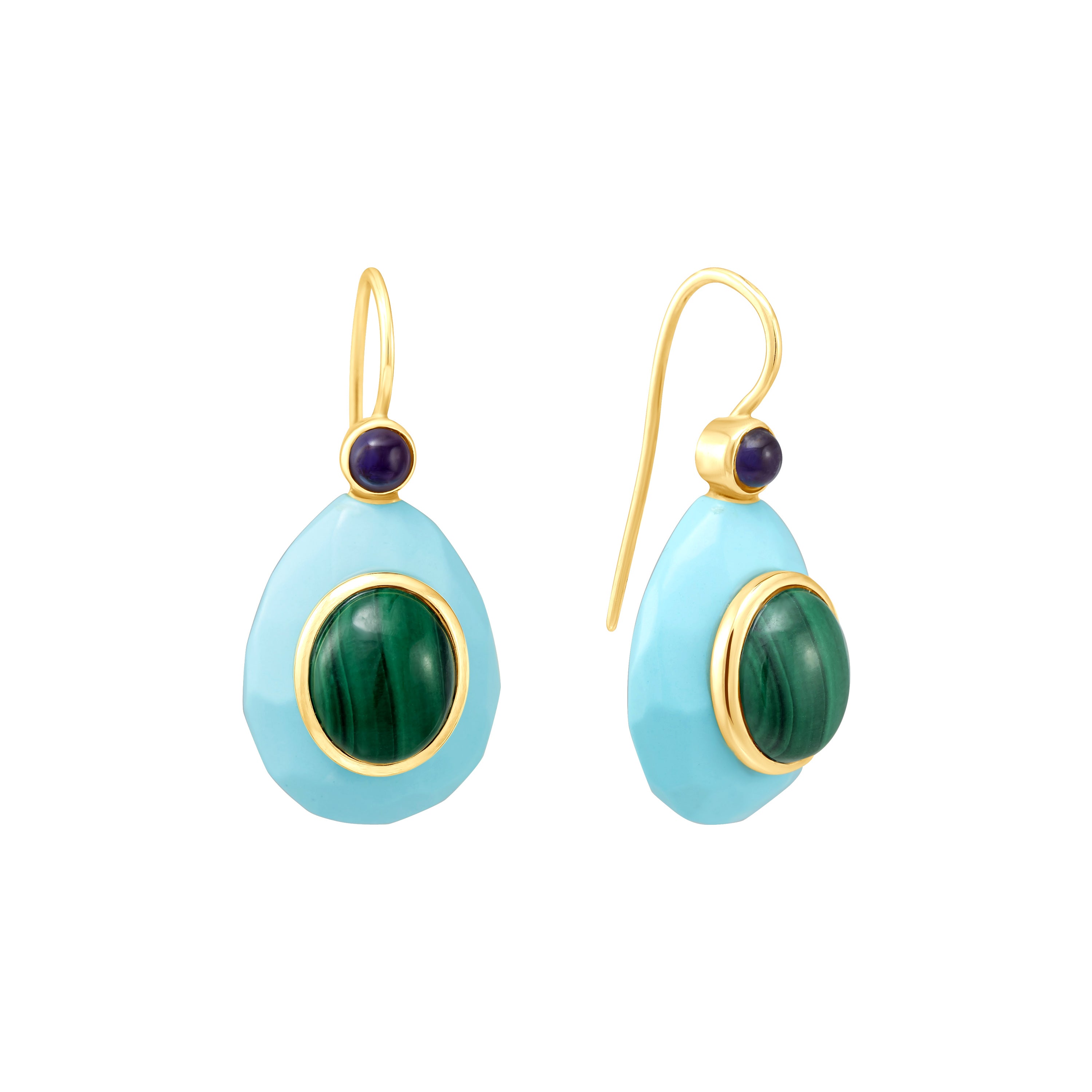 These handcrafted drop earrings pair smooth Turquoise resin drops with carved Malachite framed in 9k yellow gold, finished with round Amethyst cabochons. A vibrant Capri palette brought together in the sisters’ signature sculptural style.
