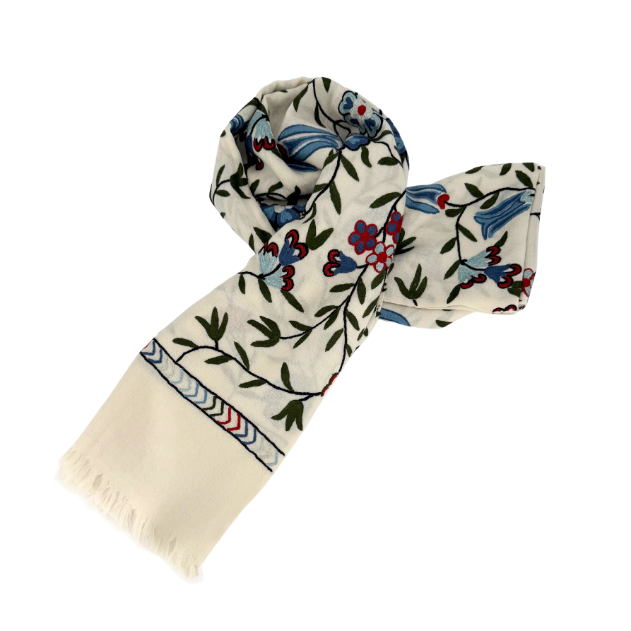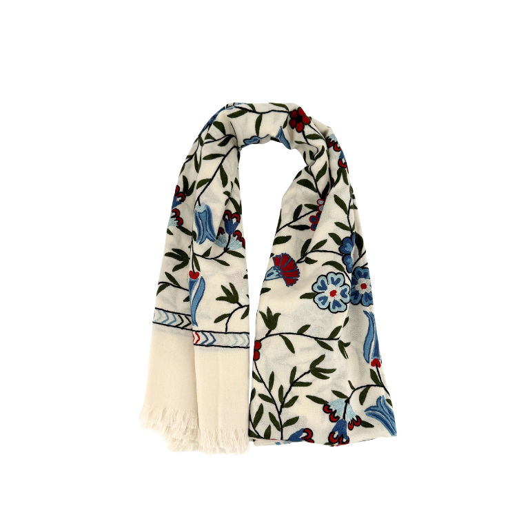 Inspired by the Iznik tiles of Istanbul’s Topkapi Palace, these exquisite shawls are hand-embroidered by the artisans of Kashmir Loom. Rendered in the softest, feather-light wool, each piece reflects Madeline Weinrib’s modern interpretation of historic patterns—delicate motifs, rich colorwork, and the quiet elegance of centuries-old craft.