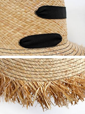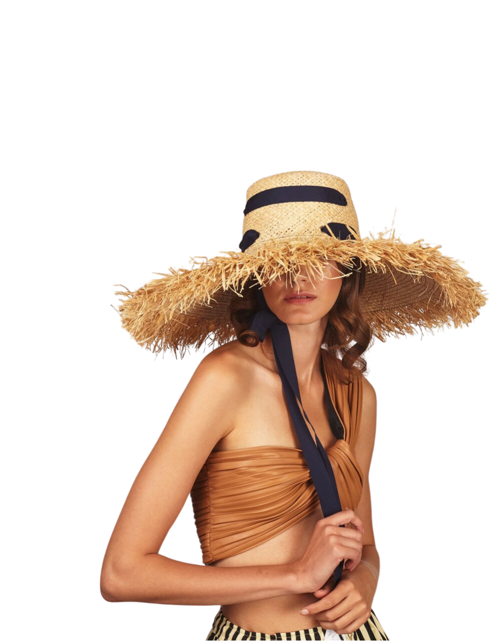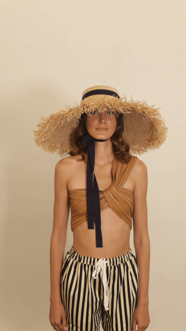 Made from a double layer of ultra-flexible woven raffia, the Alpargatas has a bucket crown that sits slightly higher on the head than a conventionally fitting hat. The brim is entirely top-stitched and has a fringed edge. A long grosgrain ribbon is threaded through eyelets to serve as a chin tie. Knot it under the left ear for a chic touch, or just let the hat hang nonchalantly down the back. The hat provides excellent UV protection.