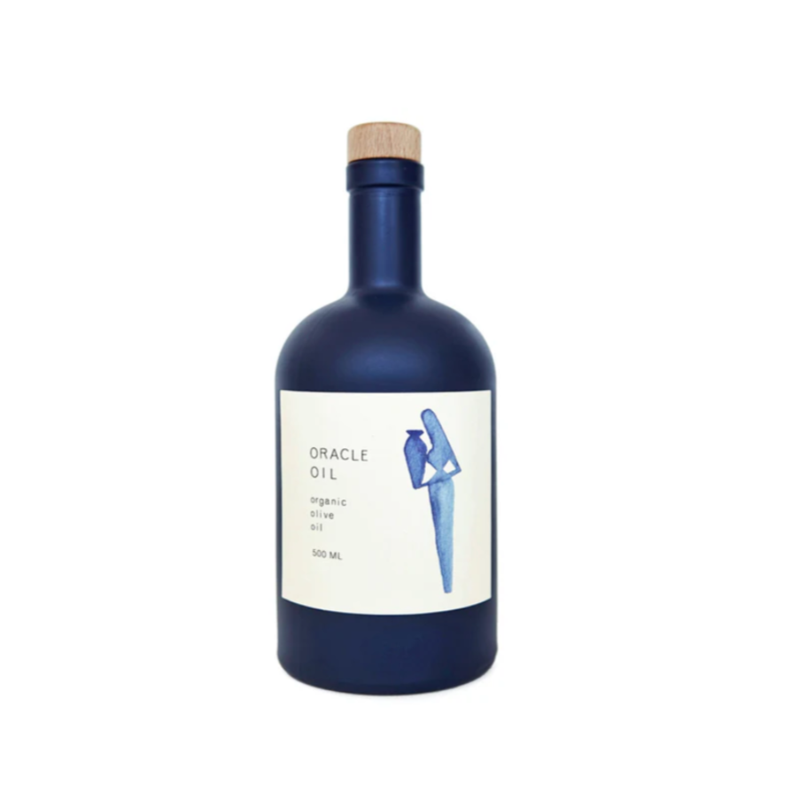 Oracle is packaged in a navy-blue bottle designed by the L.A. artist Alejandro Cardenas, and UV-coated to prevent any oxidation of the oil through light exposure. Each bottle is filled and sealed in Laconia and labeled with a date of harvest.
