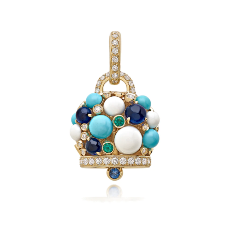 Multi-Dimensional Large Campanella charm with diamonds, emeralds, sapphires, and kogolong in 18K yellow gold.