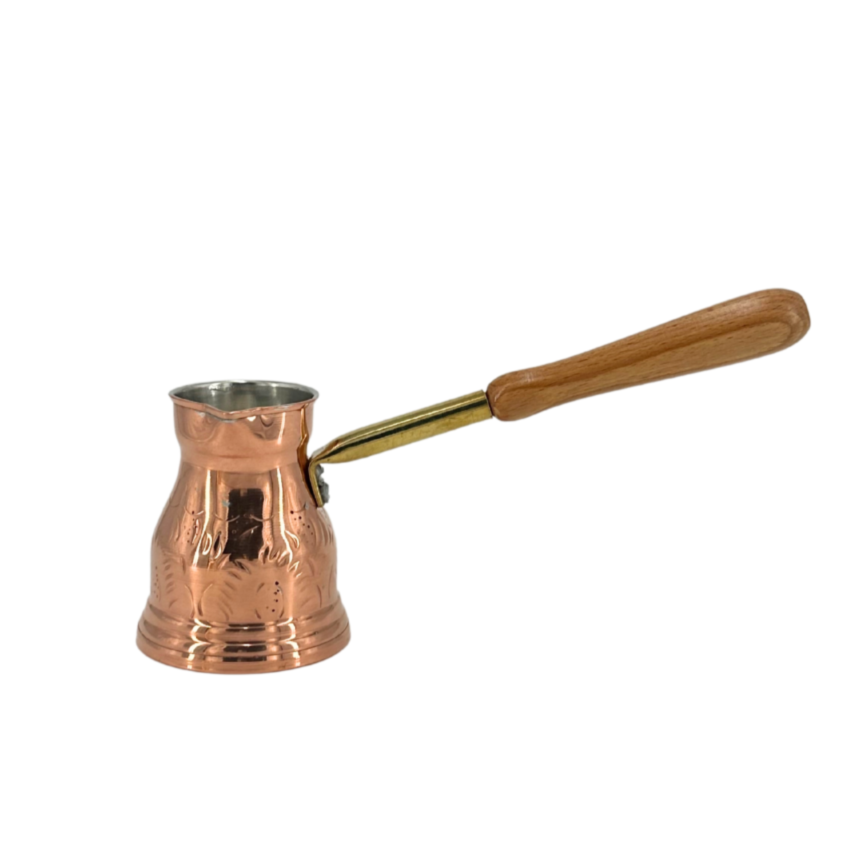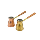 The Original Greek Coffee Pot is a beautiful, handmade coffee pot in the traditional Greek, Turkish, and Armenian style. Made from a choice of solid brass or copper with a tin lining, this small ibrik (also known as a cezve) features unique, decorative patterns in the brass, a long wooden handle, and a molded spout to ensure a smooth pour.